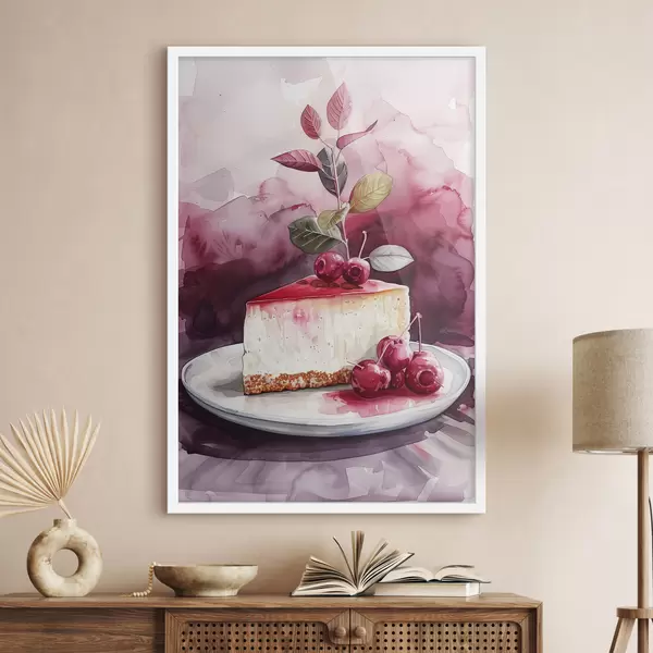 Poster Akvarell-juustukook kirssidega, elegantne toidukunst, punased ja lillad värvid Nr f39700