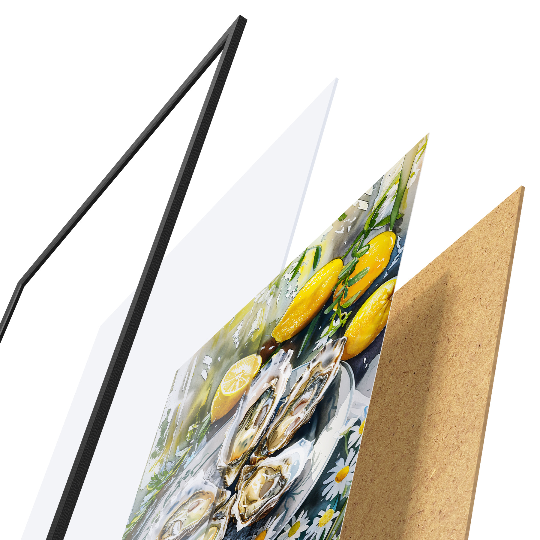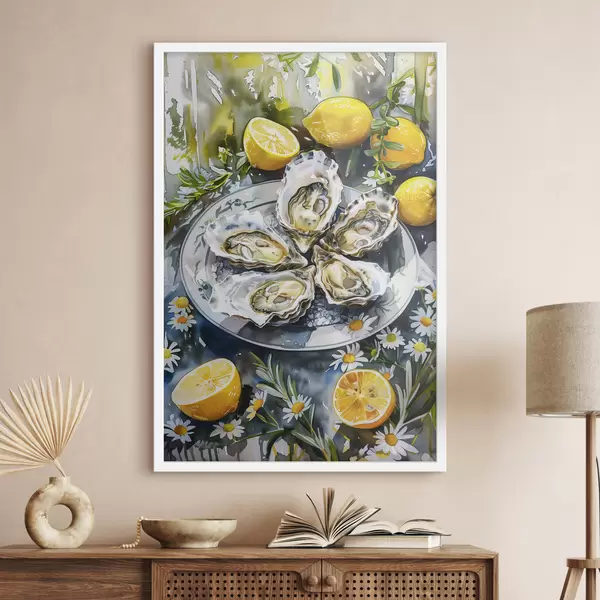 Plakat Elegantsed austrid taldrikul, sidrunid ja lilled, suvised värvid, vahemerelik f39710
