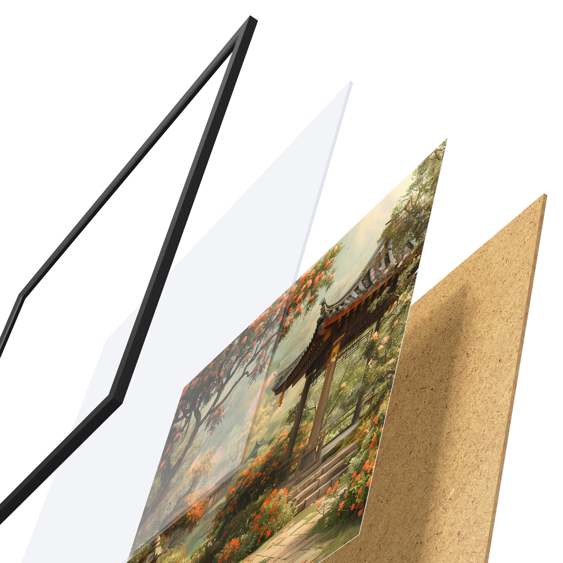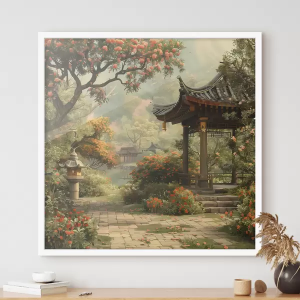 Plakat Jaapani park õitsvate puude ja lilledega, mets, aiamaja, järv f39772