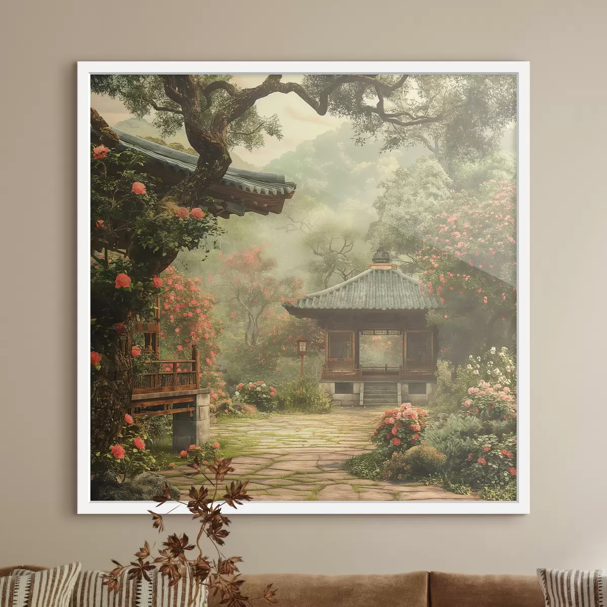 Plakat Jaapani park õitsvate puude ja lilledega, mets, puitmaja f39773