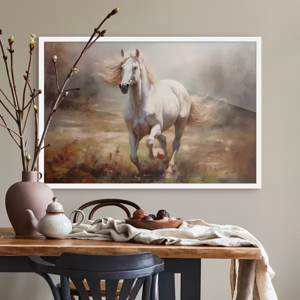 Poster Valge hobune kappamas üle heinamaa õlimaal Nr f39818
