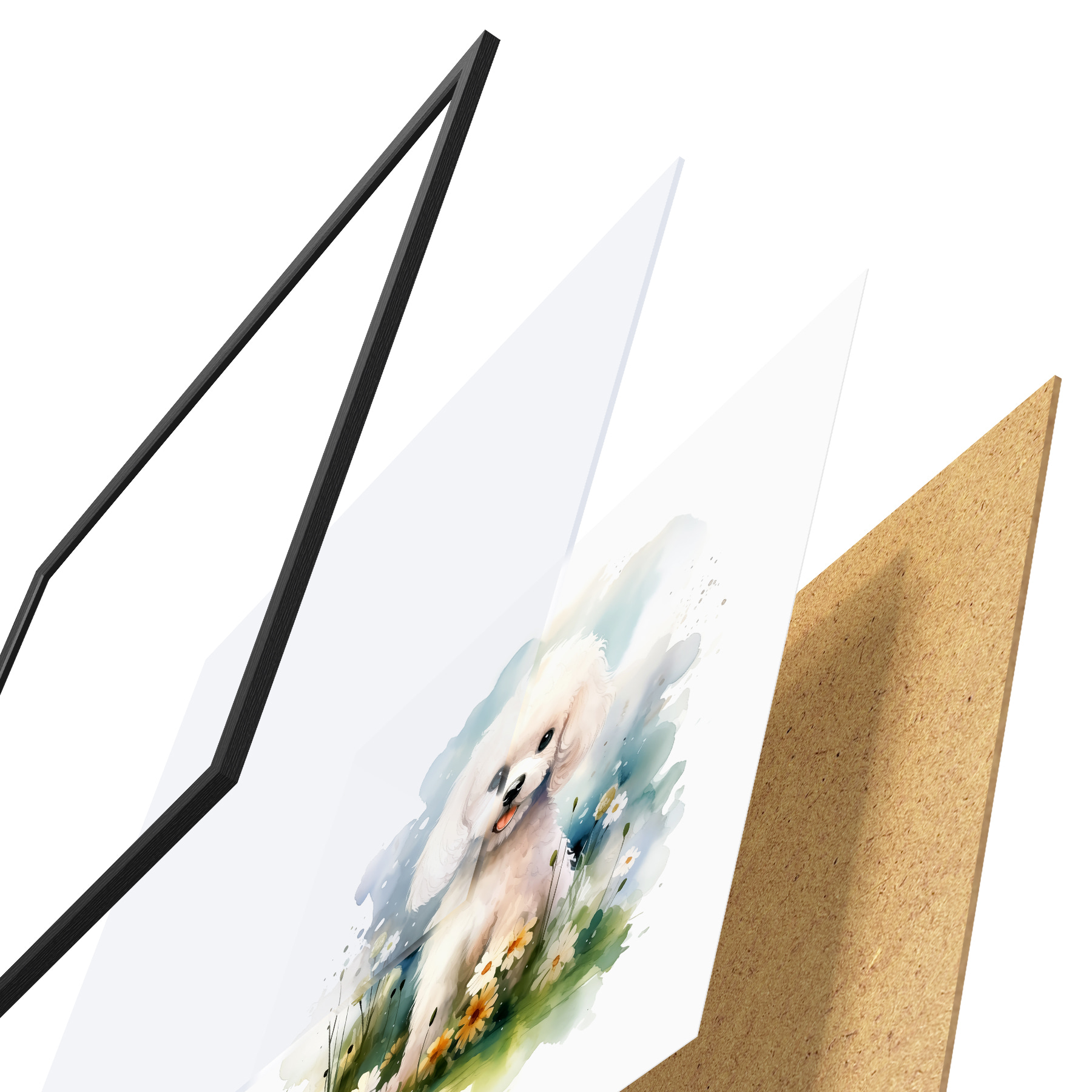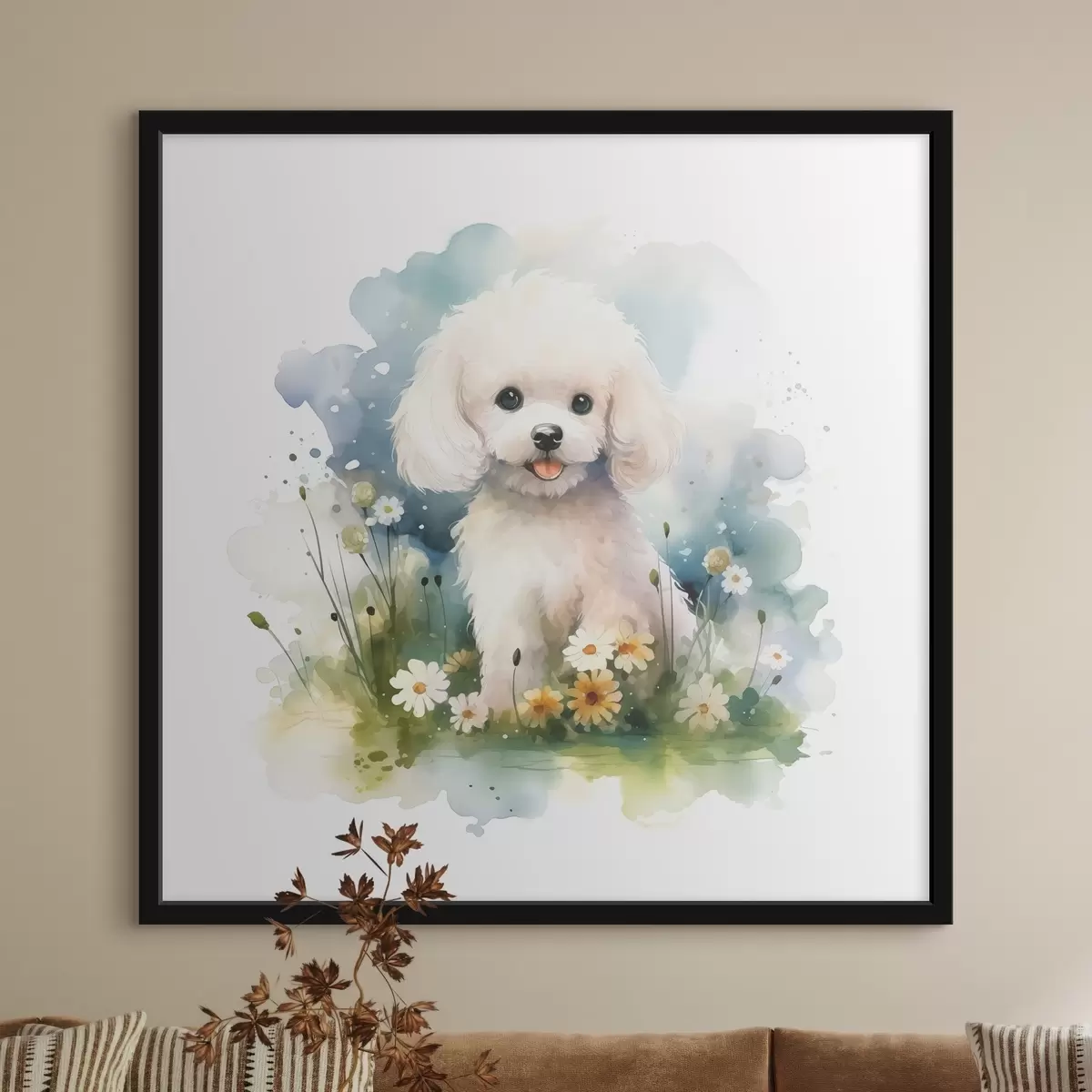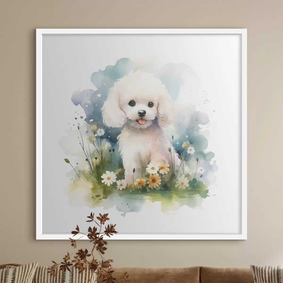Plakat Väike valge pudi istub lillede akvarellis f39928