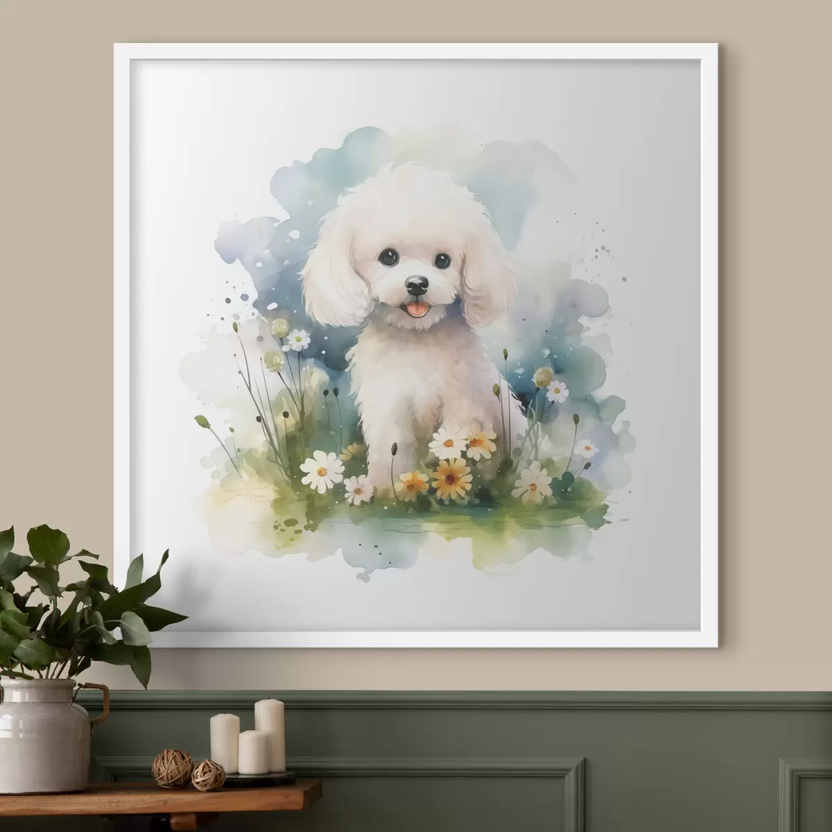 Poster Väike valge pudi istub lillede akvarellis Nr f39928