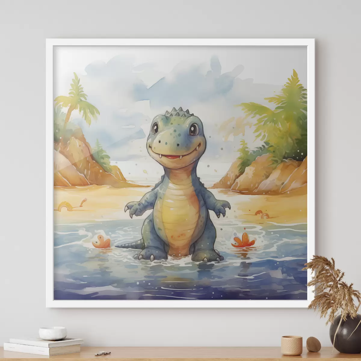 Plakat Dinosaurus jões, taustaks mäed ja akvarellpõõsad f39930