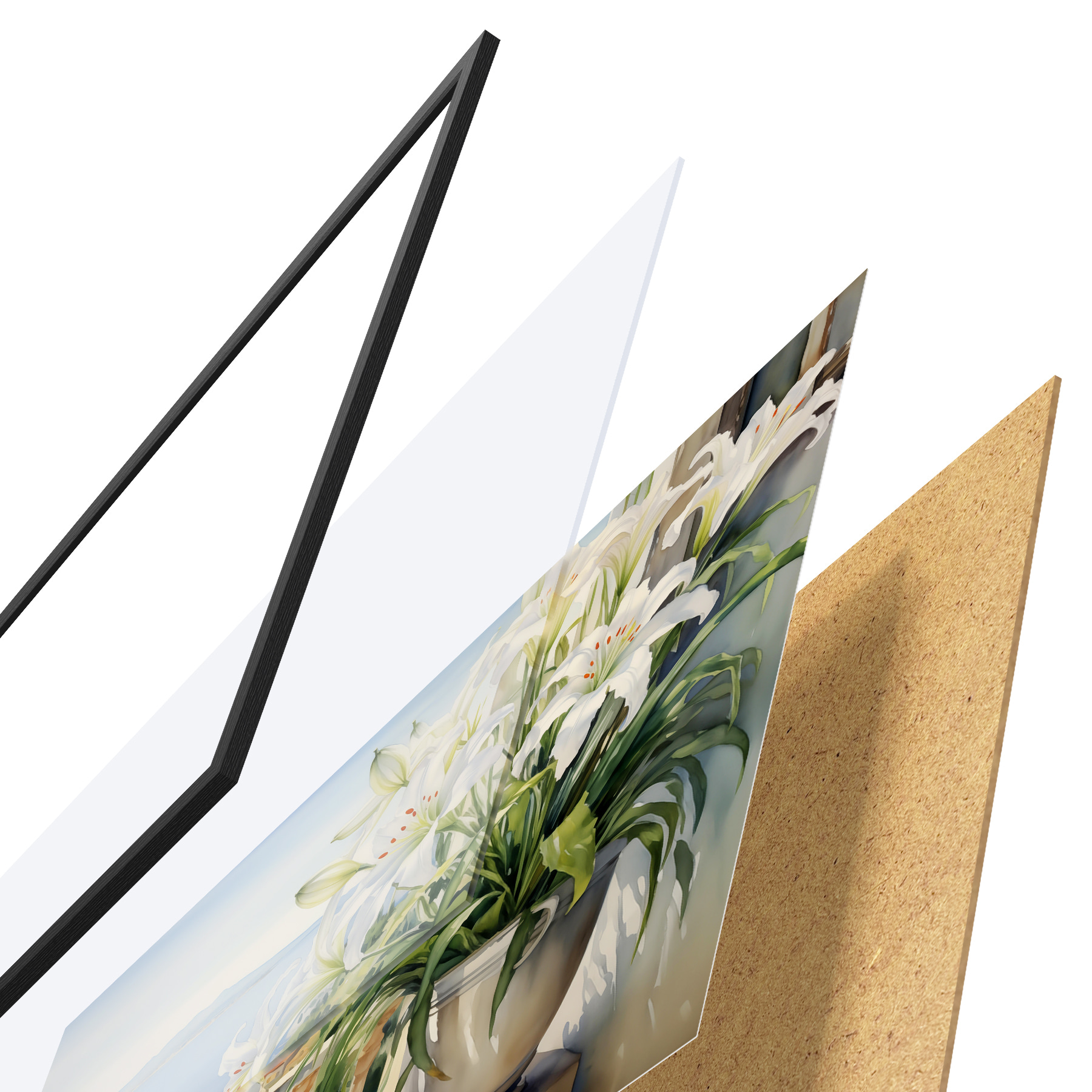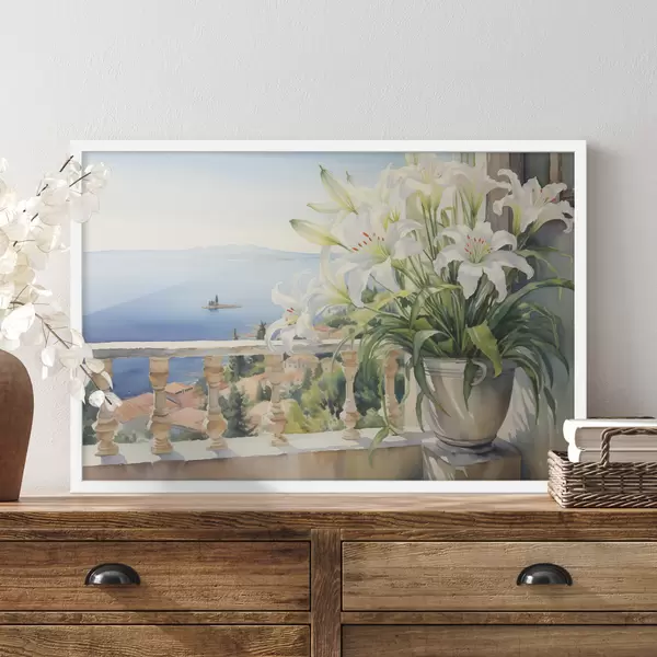 Plakat Valged liiliad potis rõdul lahe akvarelli taustal f39932