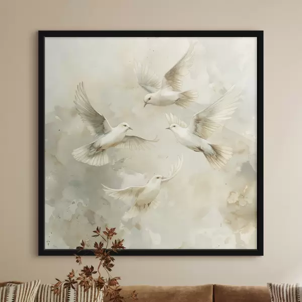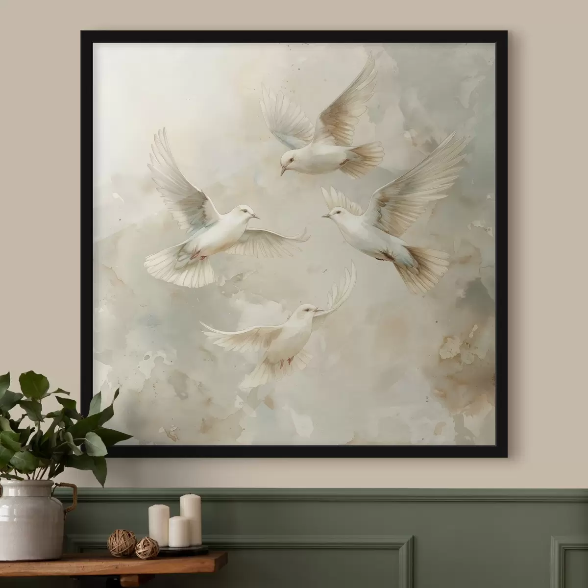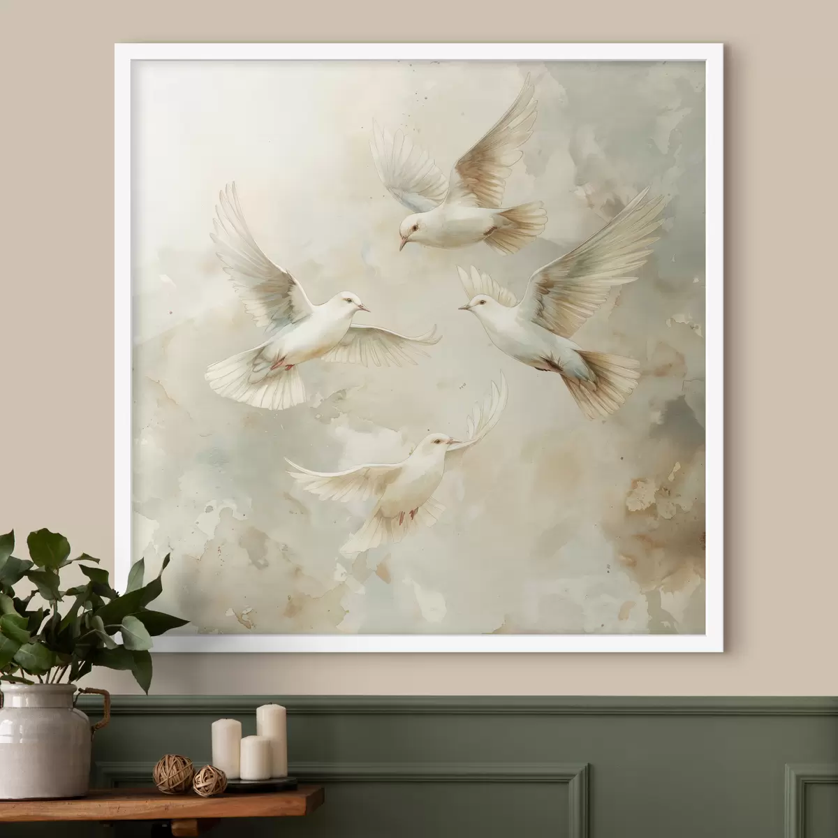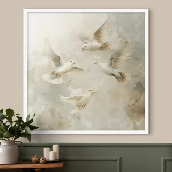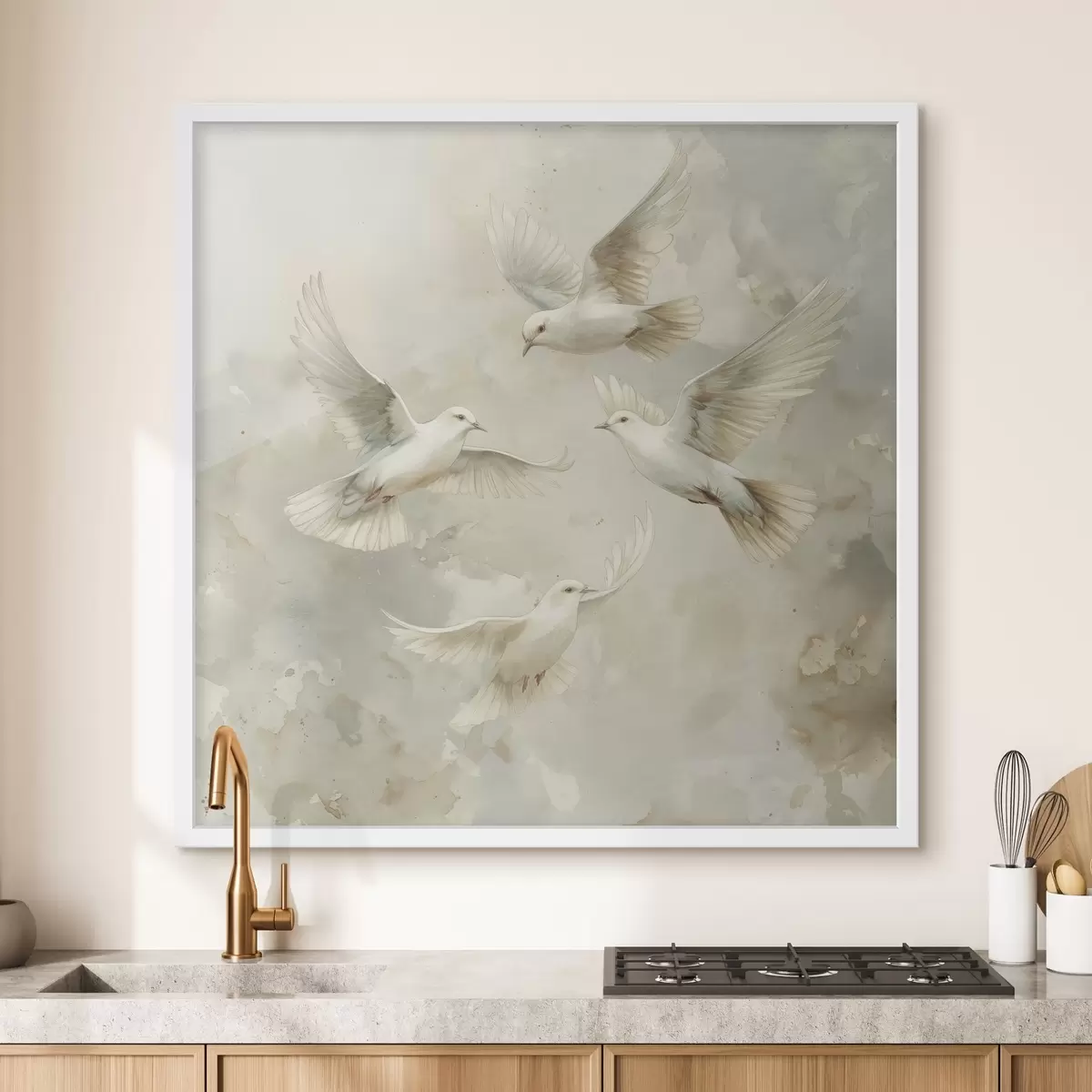 Plakat Akvarell lendavad linnud, õrnad beežid ja valged värvid, tuvid f39976