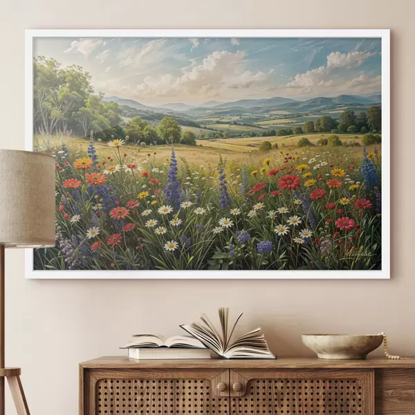 Poster Lopsakas maamaastik pilvise taeva all elava värviliste lilledega täidetud metslilleniiduga Nr f40018