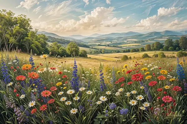 Poster Lopsakas maamaastik pilvise taeva all elava värviliste lilledega täidetud metslilleniiduga Nr f40018