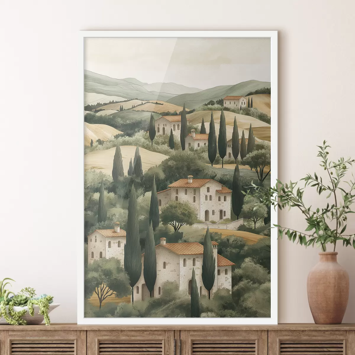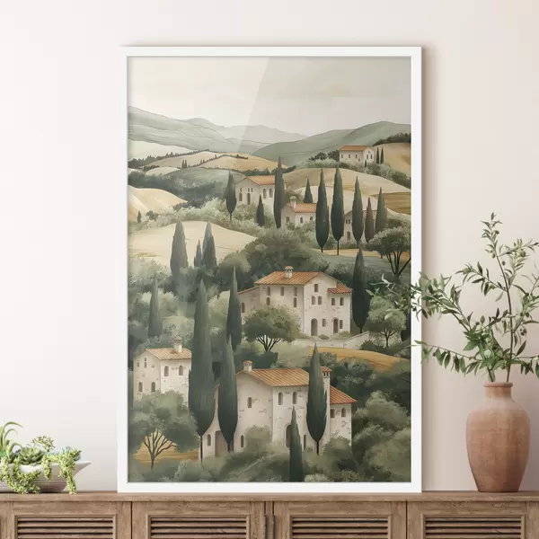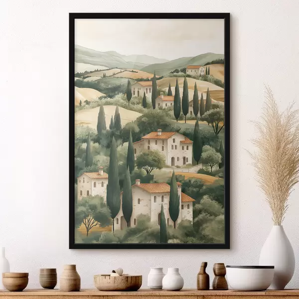 Poster Toscana maastik vanaaegsete majade, pastellvärvide, küngaste ja puudega, maalähedane Nr f40082