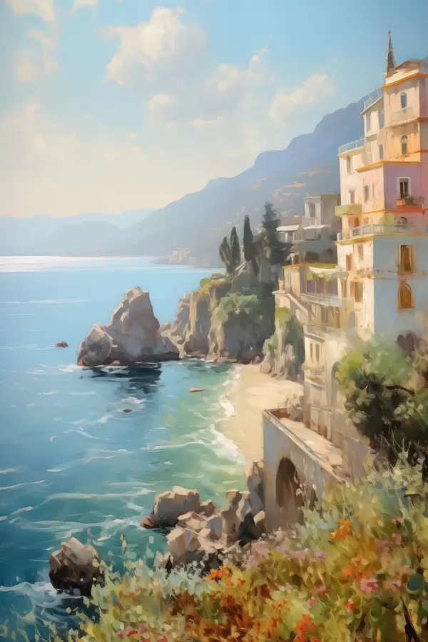 Poster Hotelli õlimaali imitatsioonist vaade mere lahele, mägedele Itaalias Nr f40088