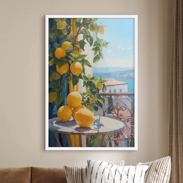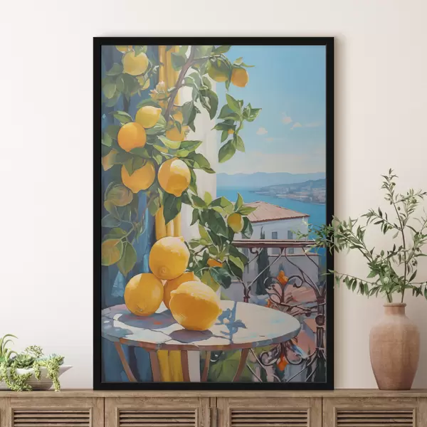 Plakat Sidrunid puul ja laud hotelli rõdul merevaatega õlimaali imitatsiooniga f40091
