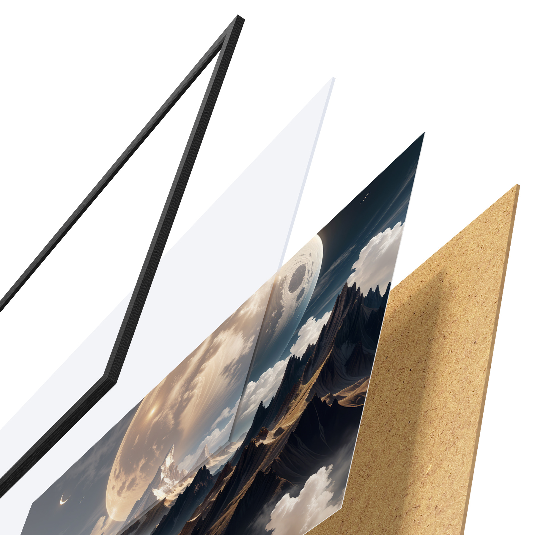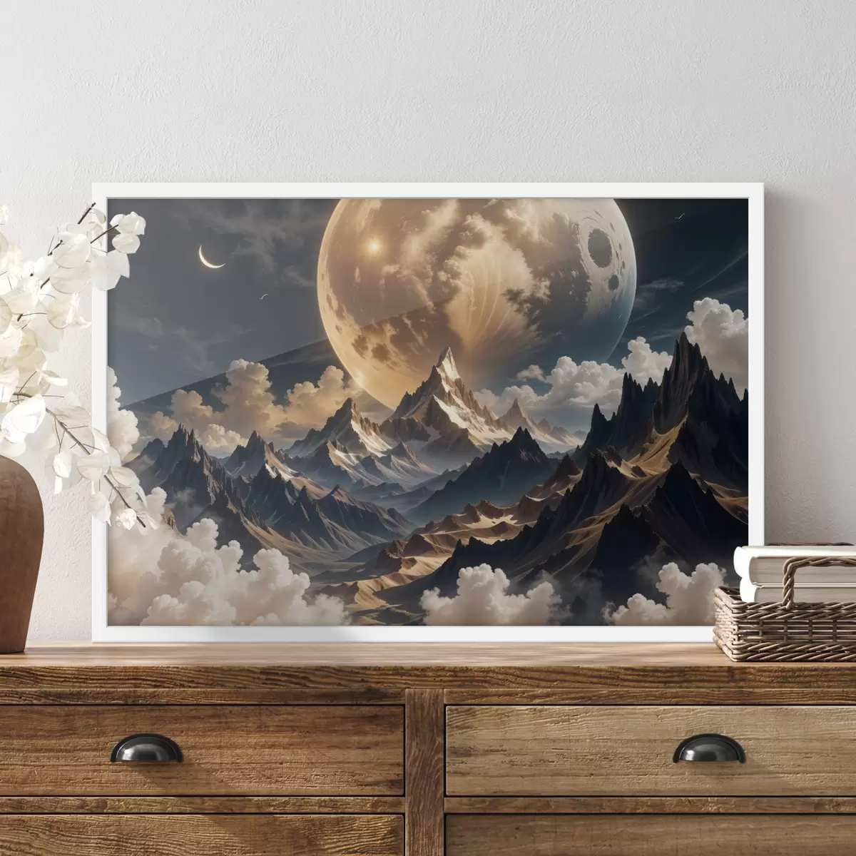 Poster Sürrealistlik maastik lumiste mägedega massiivse täiskuu all ja vingete pilvedega Nr f40147
