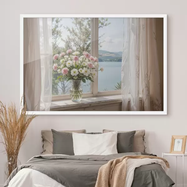 Plakat Roosade ja valgete lillede kimp aknalauale asetatud klaasvaasis maalilise järve ja mägedega f40151