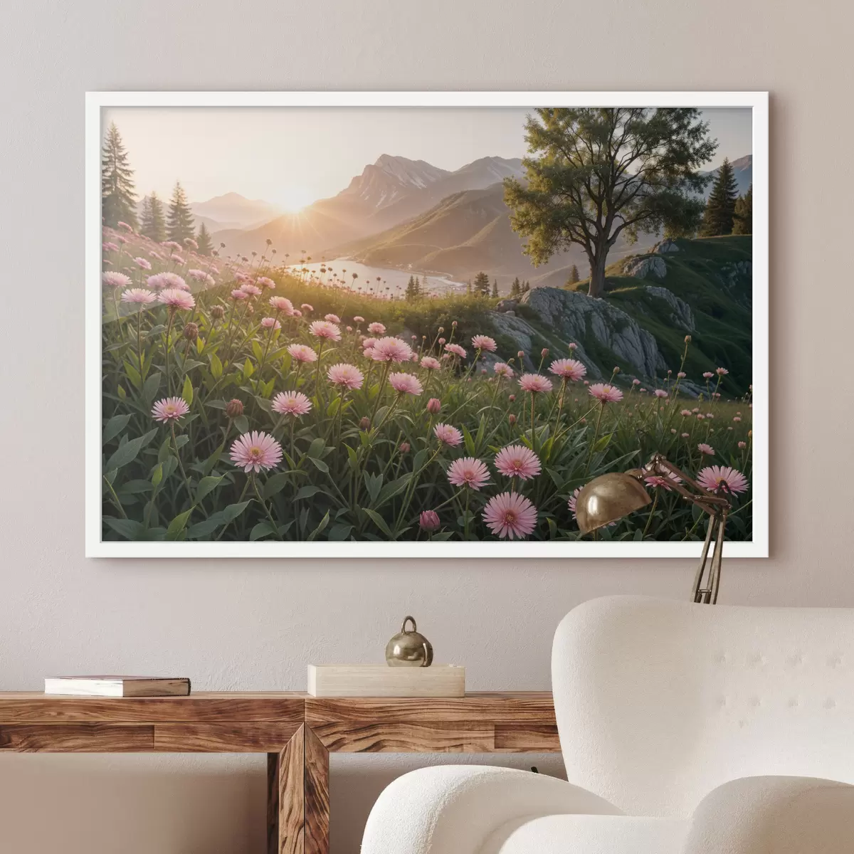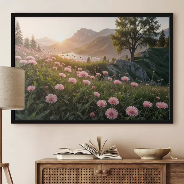 Poster Esiplaanil roosade karikakrataoliste lillede väli, taamal suur mäeahelik Nr f40154
