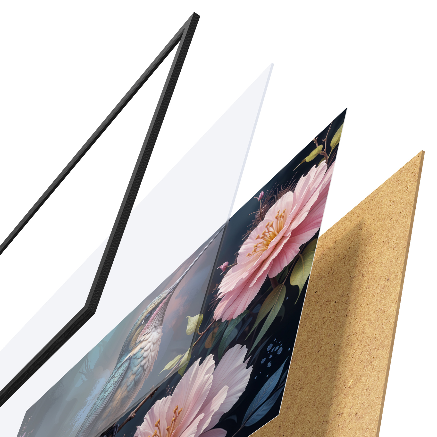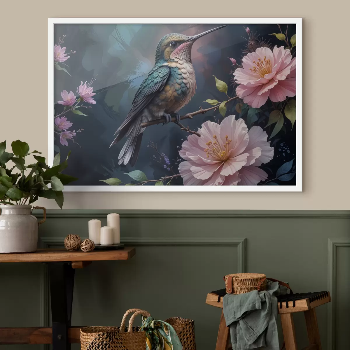 Plakat Oksal istub värviline koolibri, mille taustal säravad roosad õied f40155