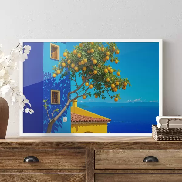 Poster Ookeanivaatega sinise seina ja kivikatusega hoonel kasvab küpsete viljadega apelsinipuu Nr f40159