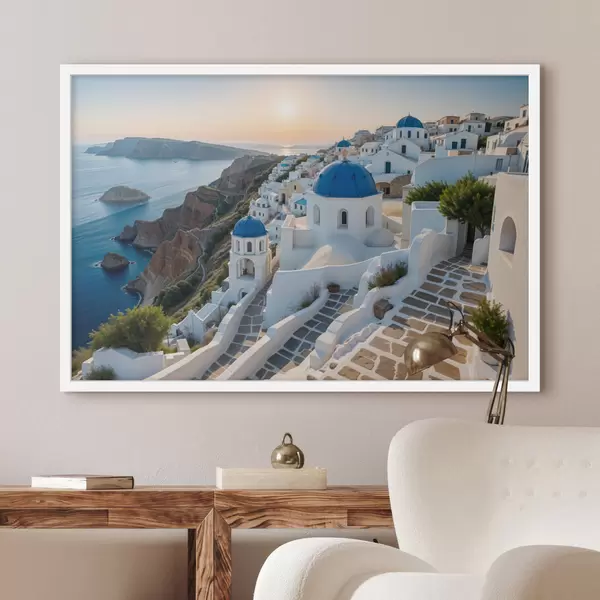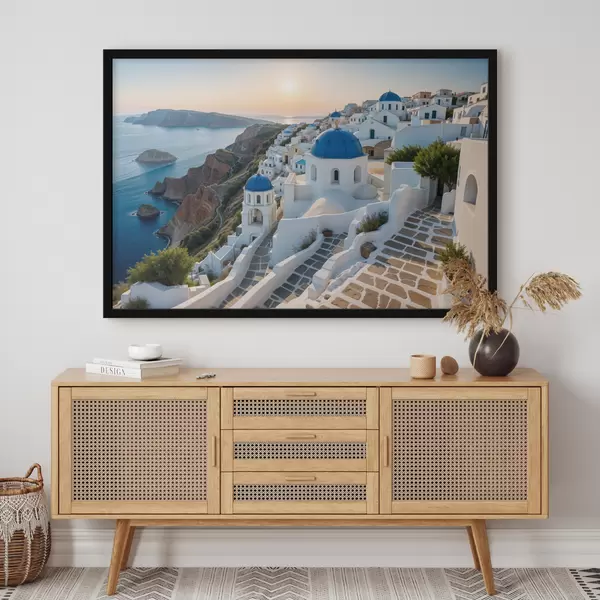 Plakat Santorini saar, Kreeka. Linn on ehitatud mäenõlvale, kust avaneb vaade Egeuse merele f40160