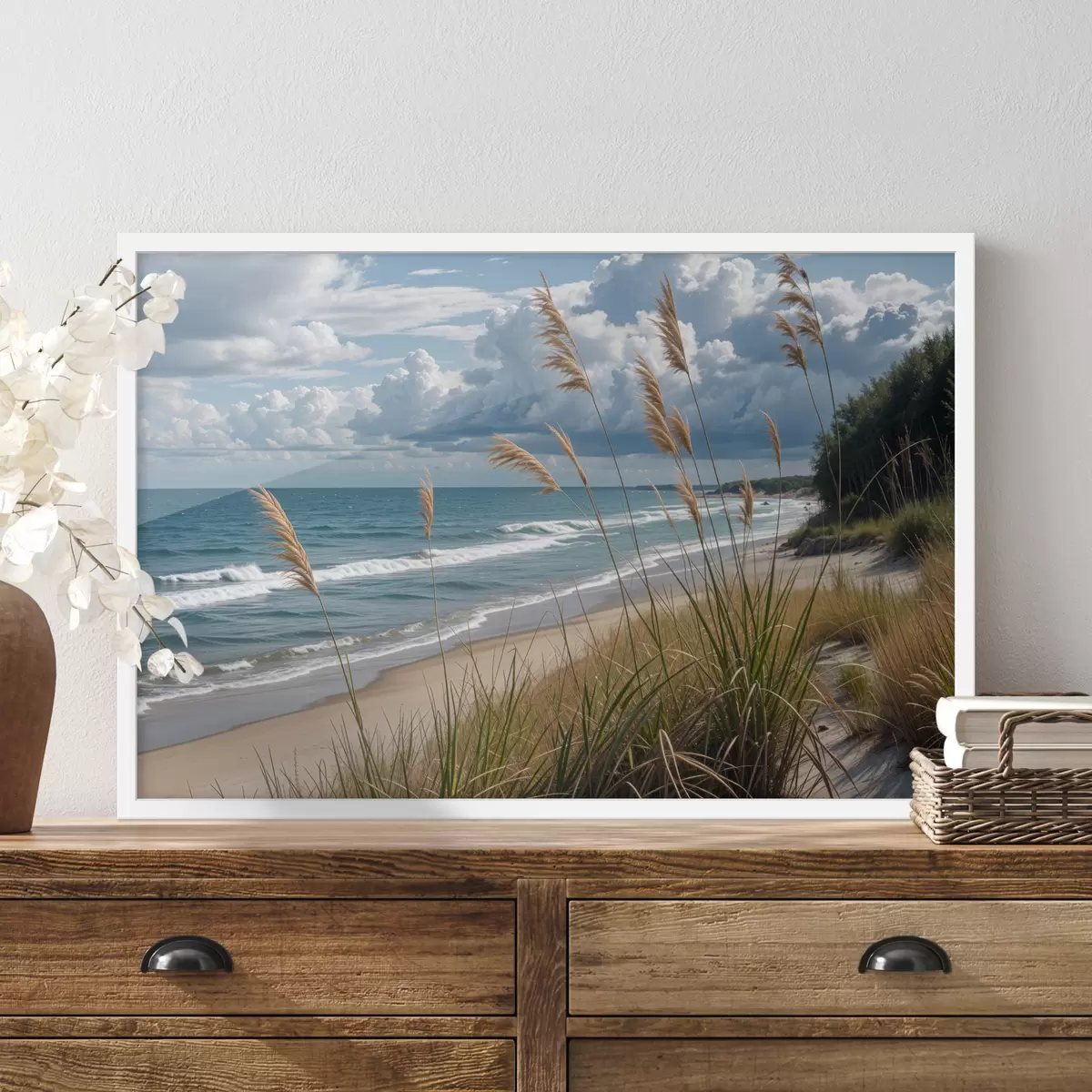Poster Maaliline rand tuule käes õõtsuva kõrge rohuga, vaatega ookeanile, kus lained ja pilves taevas Nr f40161