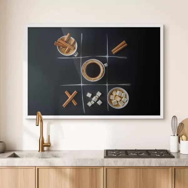 Plakat Tass kohvi kaneelipulkade, suhkrukuubikute ja vahukommidega, mis on paigutatud tic-tac-toe-võrku f40163