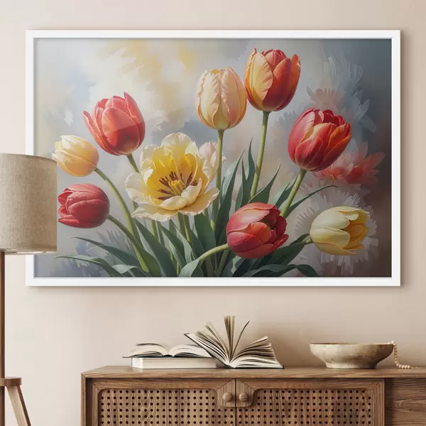 Plakat Värvilised tulbid heledal taustal punase, oranži ja kollase erinevates toonides f40167