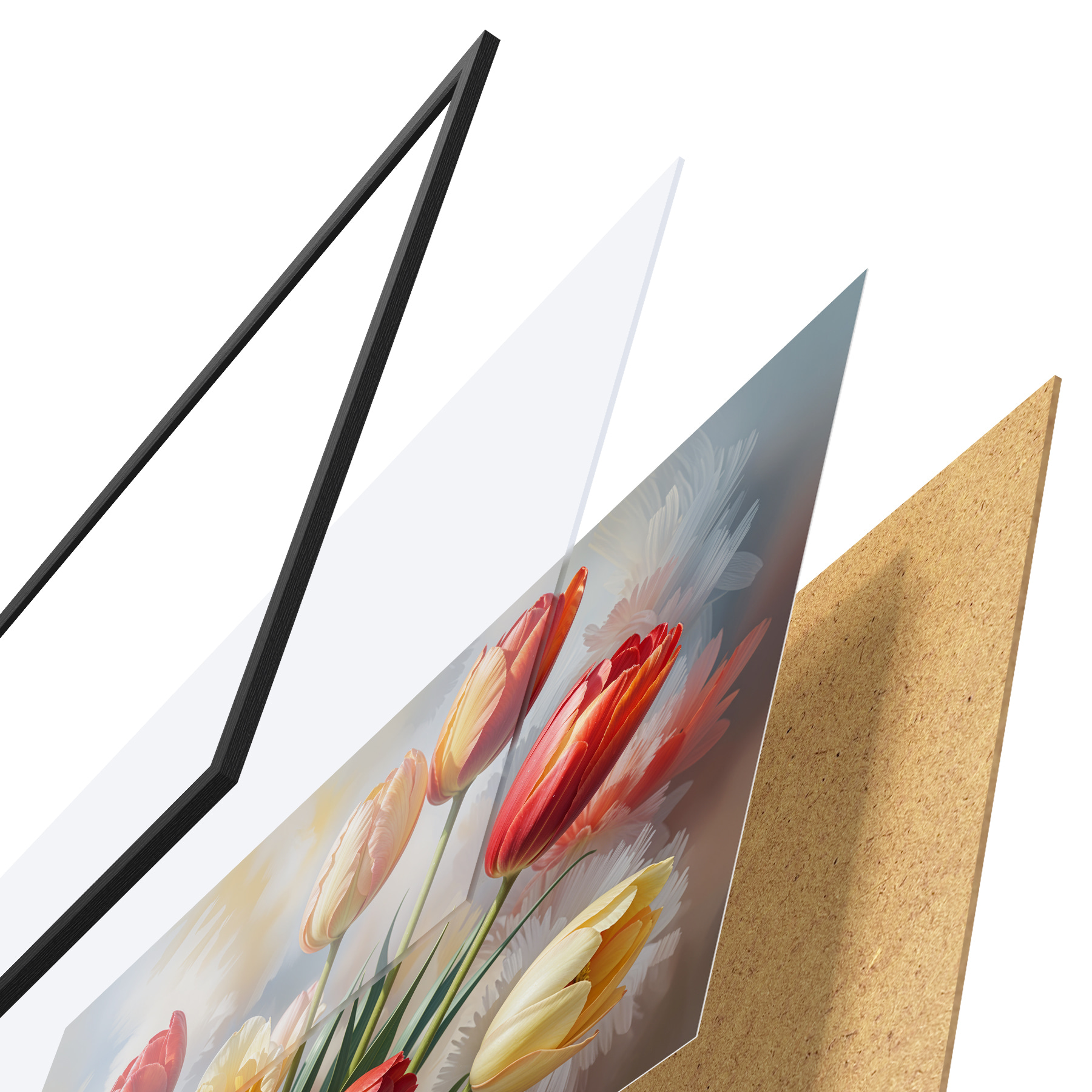 Poster Värvilised tulbid heledal taustal punase, oranži ja kollase erinevates toonides Nr f40167