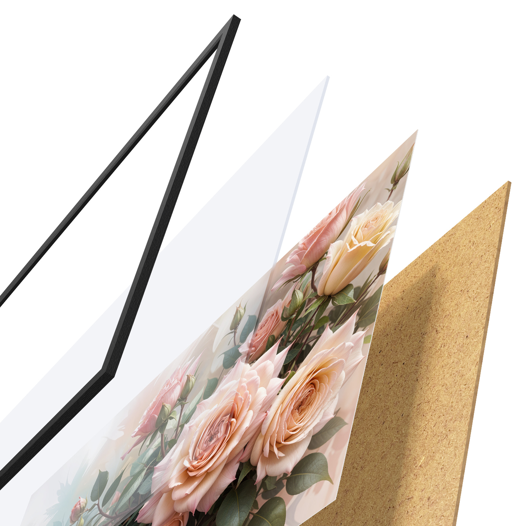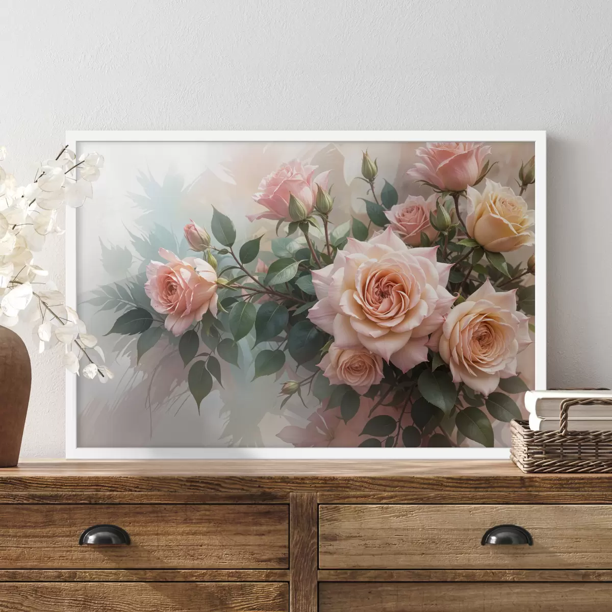 Poster Roheliste lehtedega kaunite roosade rooside kimp pehmel udusel taustal Nr f40168