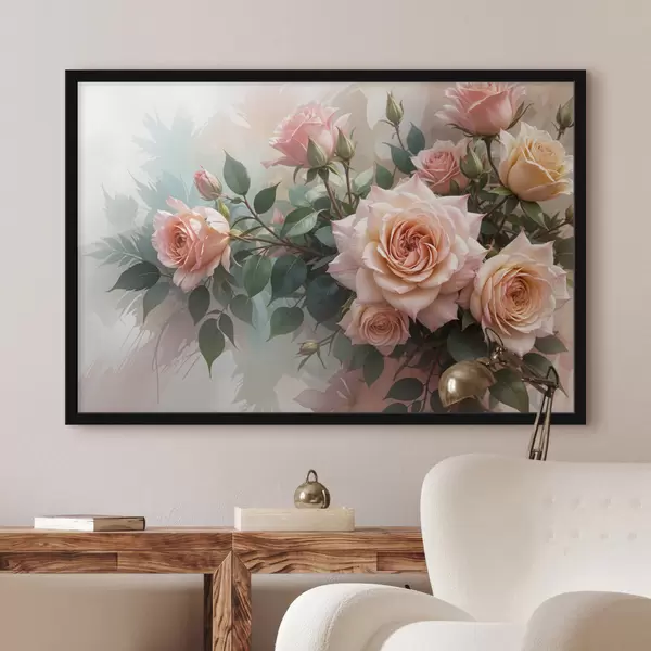 Plakat Roheliste lehtedega kaunite roosade rooside kimp pehmel udusel taustal f40168