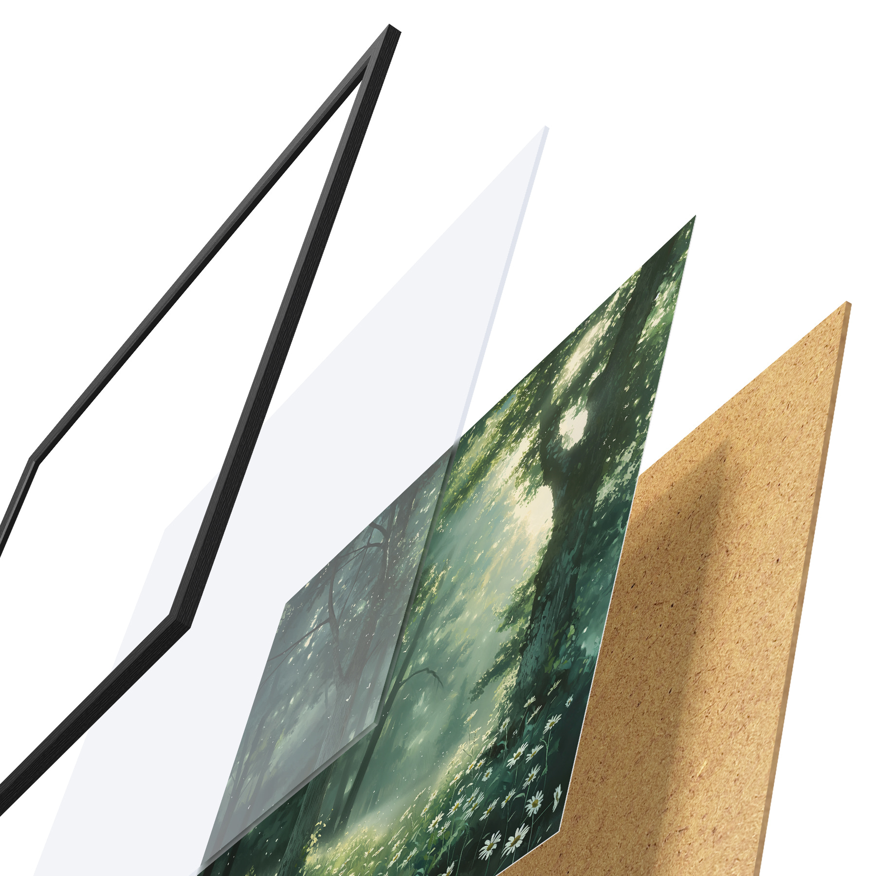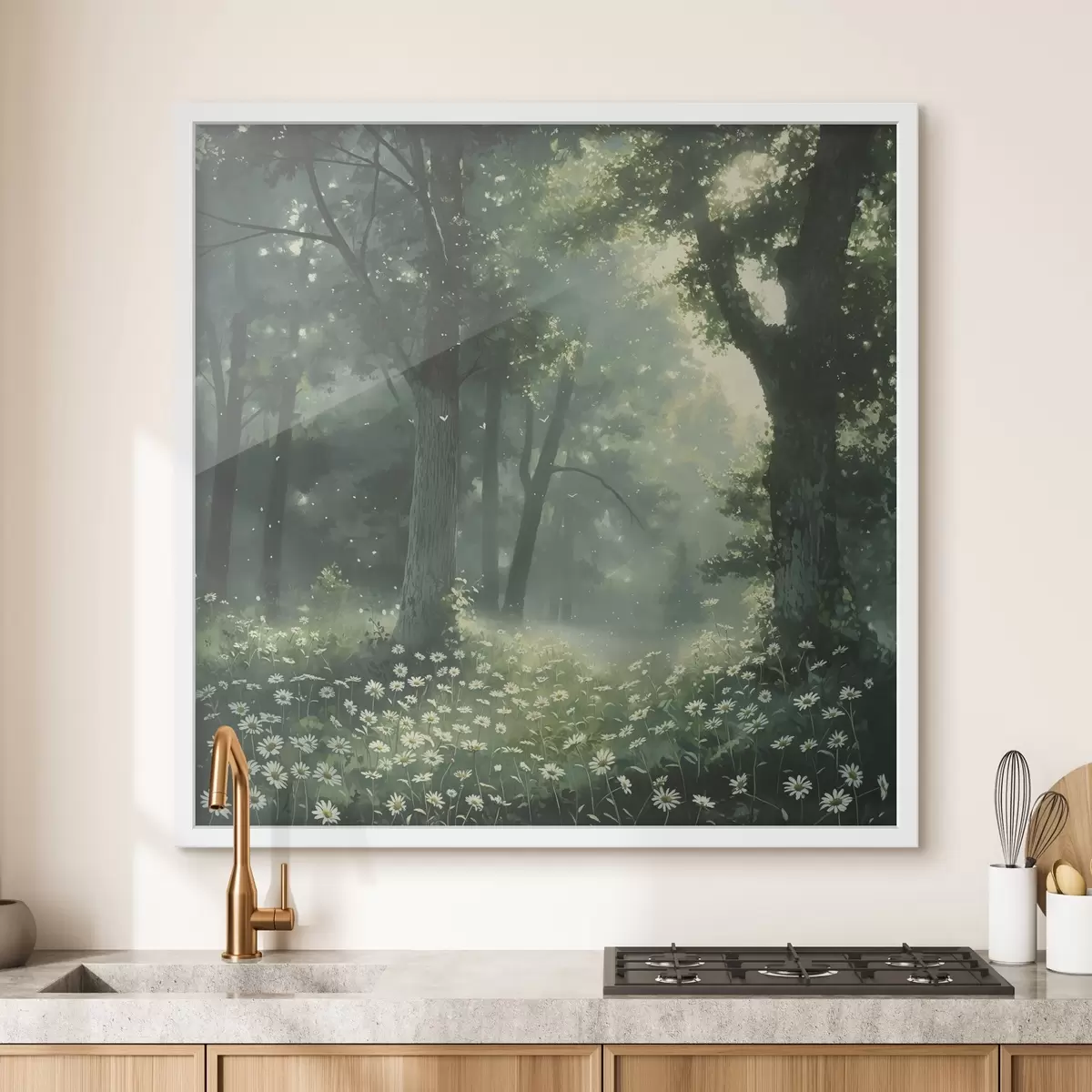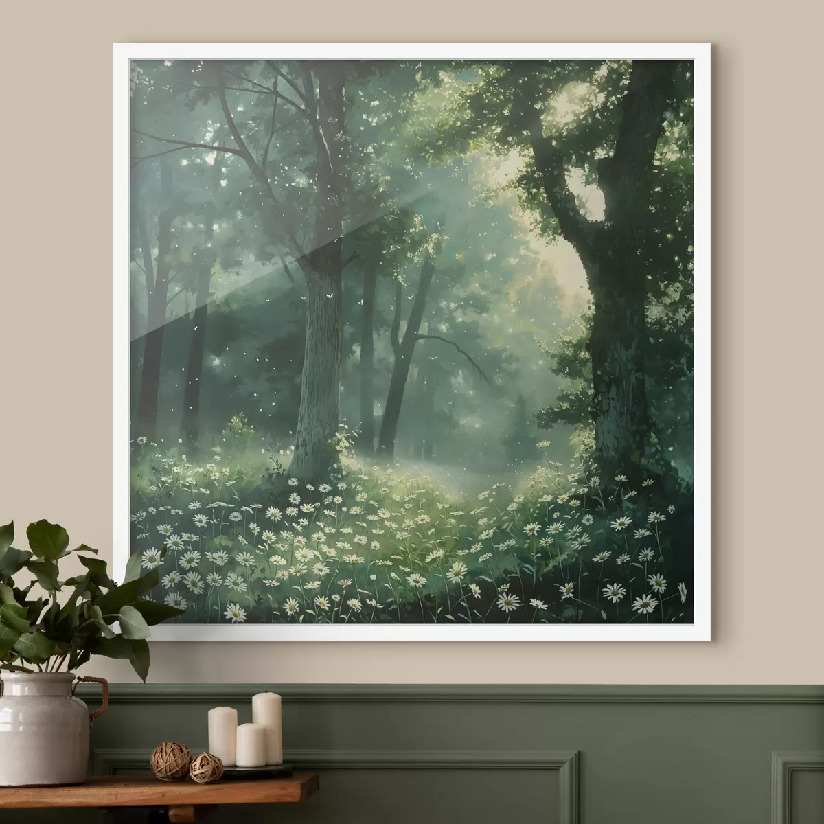 Plakat Tihe mets koos päikesevalgusega puudes, kummelililled, roheline rohi, loodus f40224