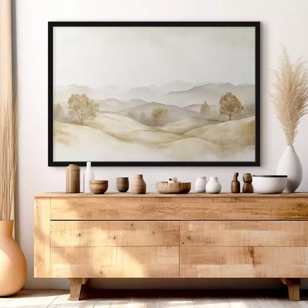 Poster Loodusmaastik beežis värvipaletis, heinamaa, puud, akvarelljoonistus Nr f40231