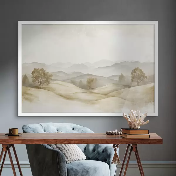 Plakat Loodusmaastik beežis värvipaletis, heinamaa, puud, akvarelljoonistus f40231