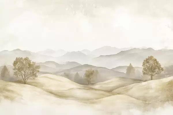 Poster Loodusmaastik beežis värvipaletis, heinamaa, puud, akvarelljoonistus Nr f40231