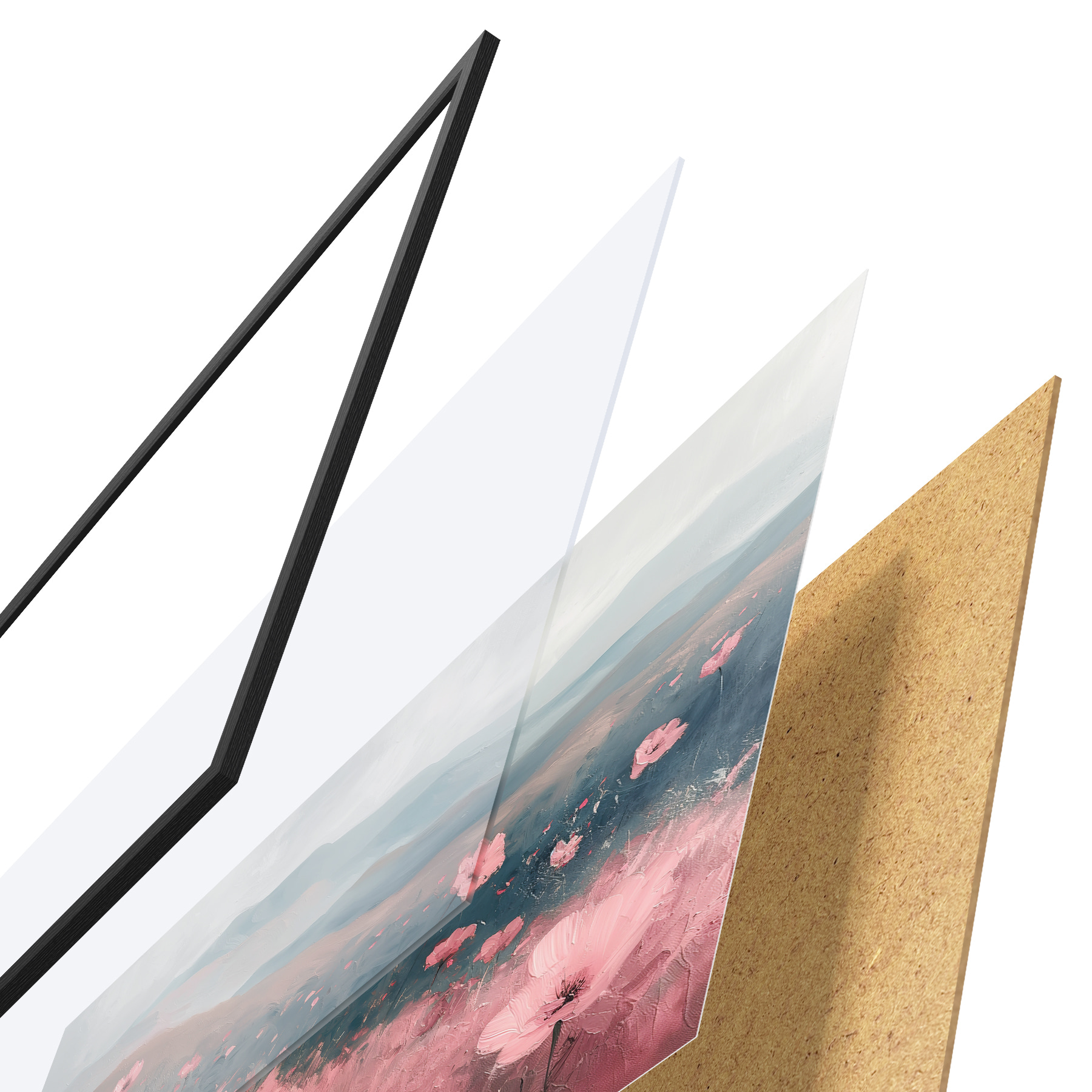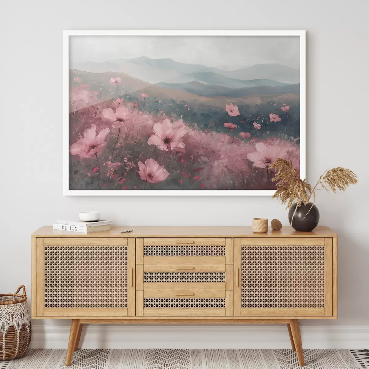 Plakat Roosad lilled heinamaal, loodusmaastik, mäed, õlimaal, erksad pintslitõmbed f40233