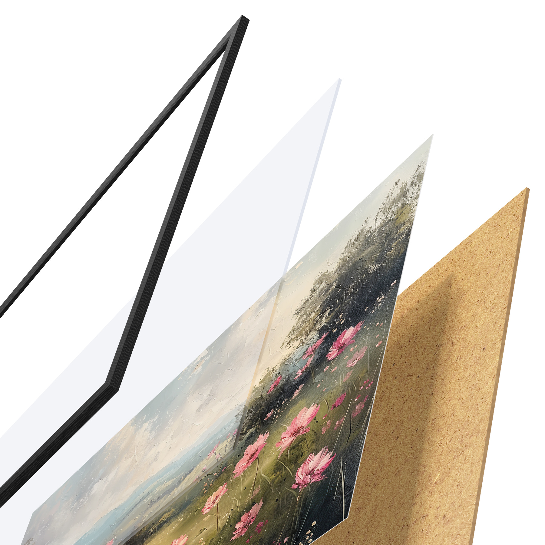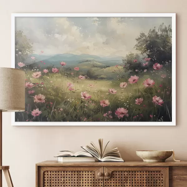 Plakat Roosade lilledega heinamaa, roheline muru, loodusmaastik, taevas pilvedega, akrüüljoonistus f40234