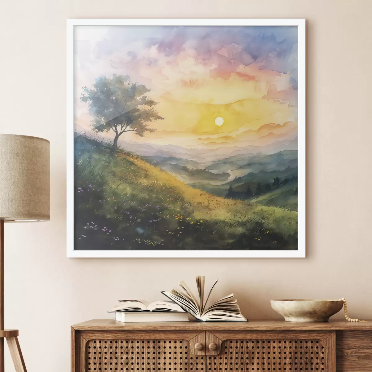 Poster Mägede ja puudega heinamaa, lilled, akvarell Nr f40303