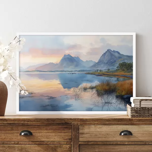 Poster Rahulik jõgi koos mägedega, päikesetõus, pehmed värvid Nr f40307