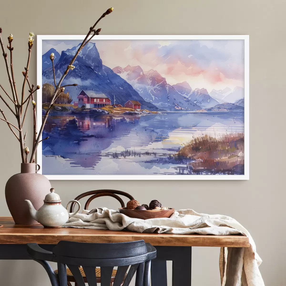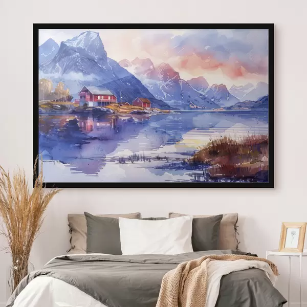 Poster Norra küla, päikeseloojangu taevas, rahulik jõgi, mäed, akvarell Nr f40311