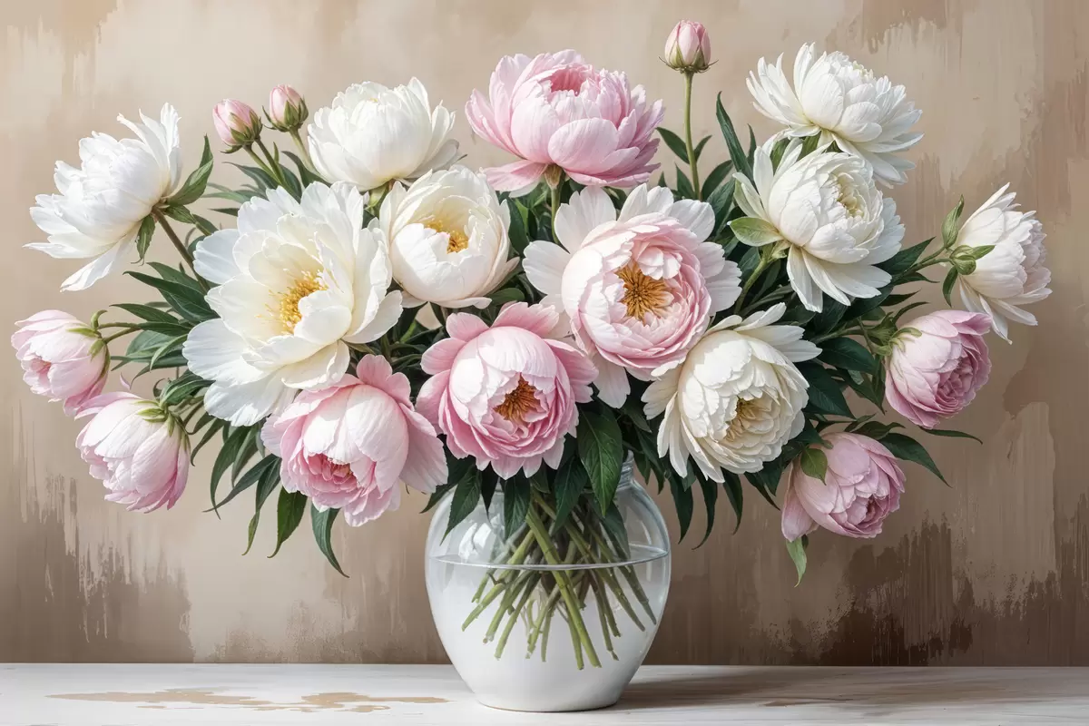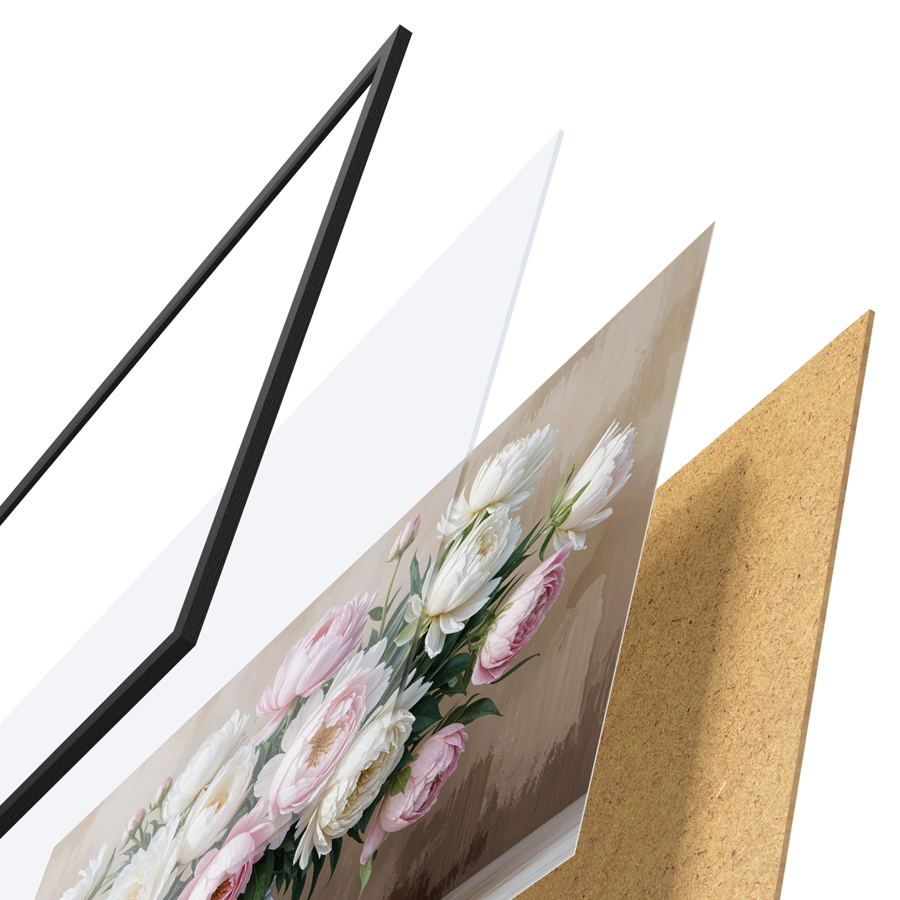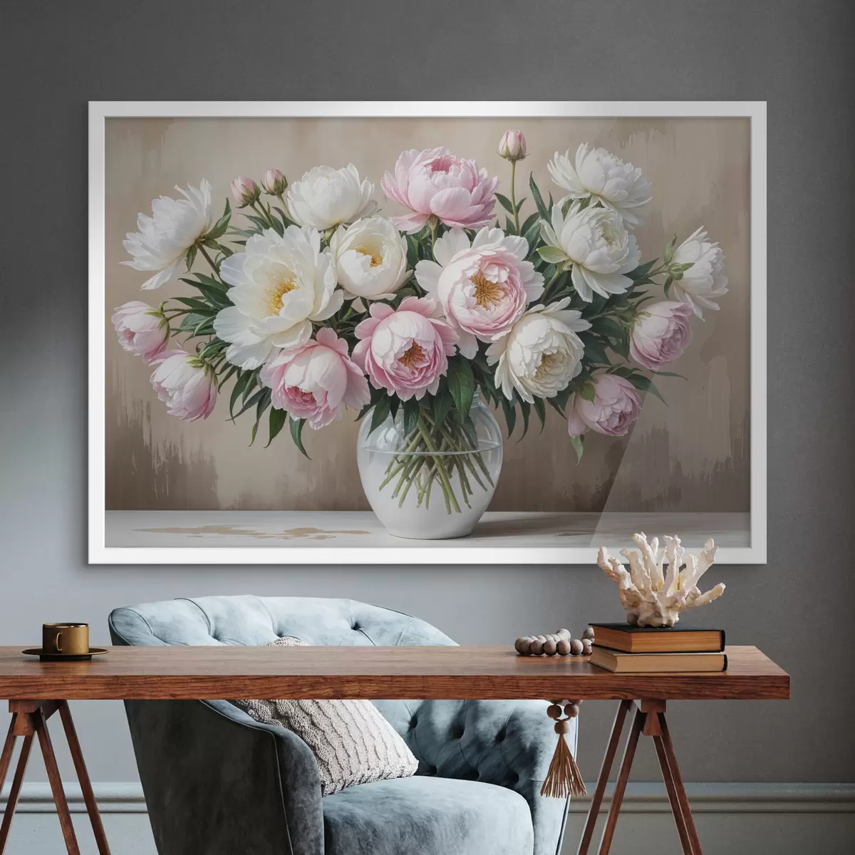 Poster Puitpinnale paigutatud klaasist vaasis kaunite roosade ja valgete pojengide kimp Nr f40398