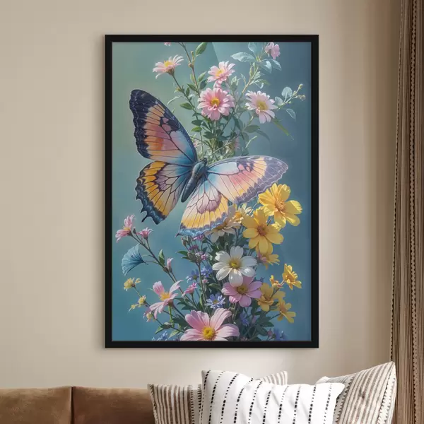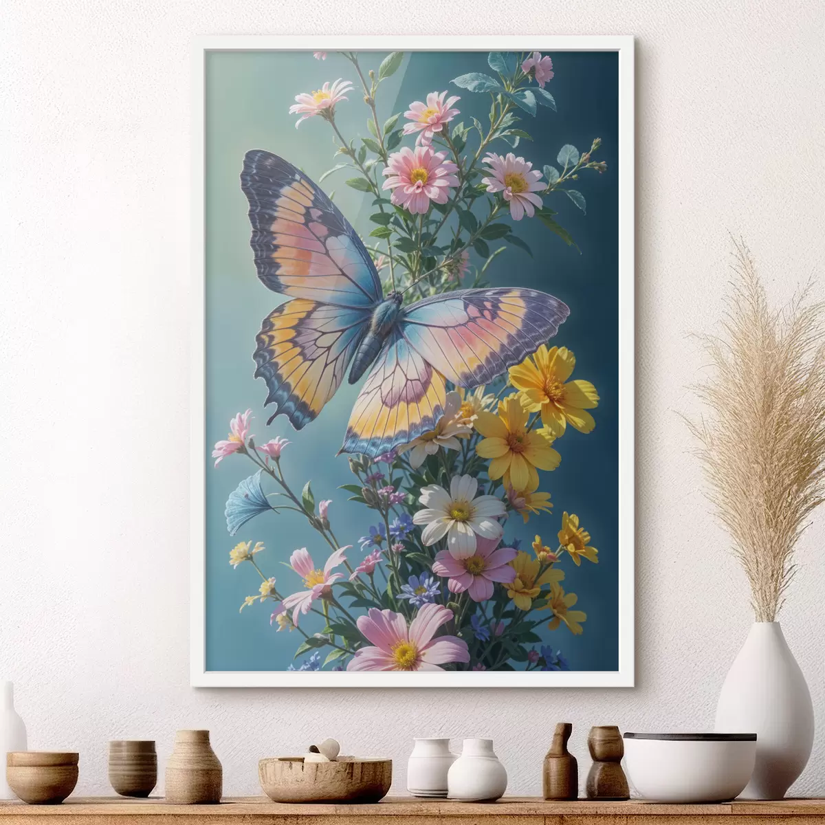 Poster Suur värviline liblikas tumerohelisel taustal roosade ja kollaste lillede kimbul Nr f40411