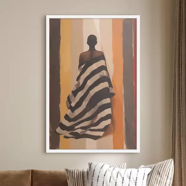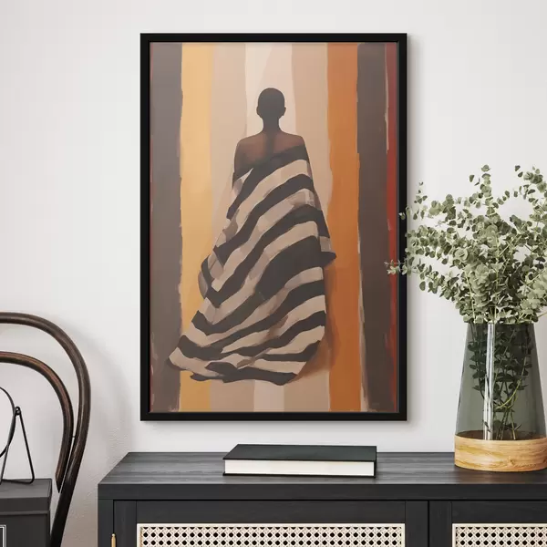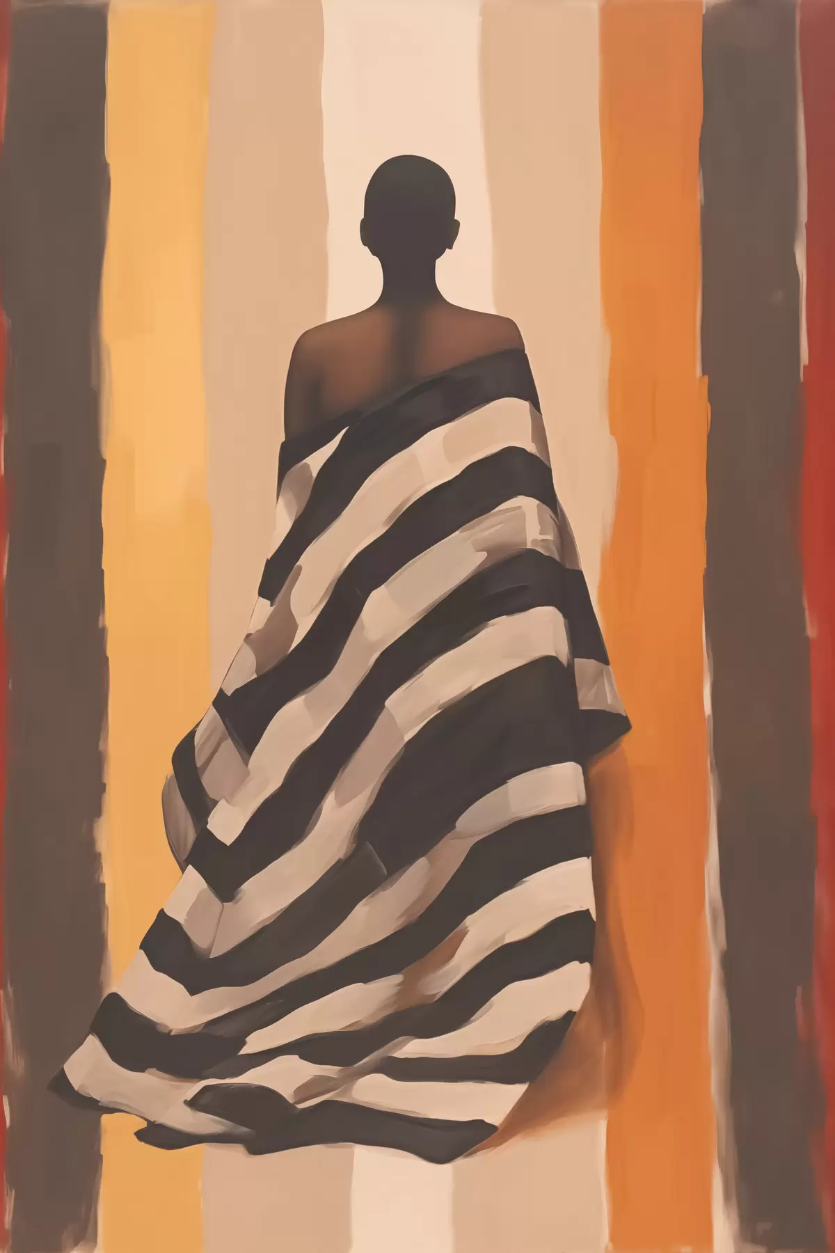 Plakat Aafrika ameeriklanna siluett triibulise keebiga taustal vertikaalsete triipudega, must, beež, kollane, punane, pruun f40487