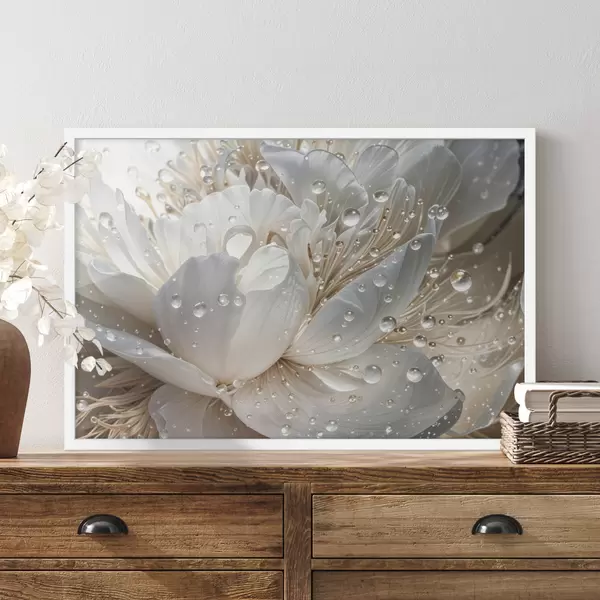 Plakat Lähivõte valgest pojengiõiest, mille kroonlehtedel on veepiisad, hägusel taustal f40539
