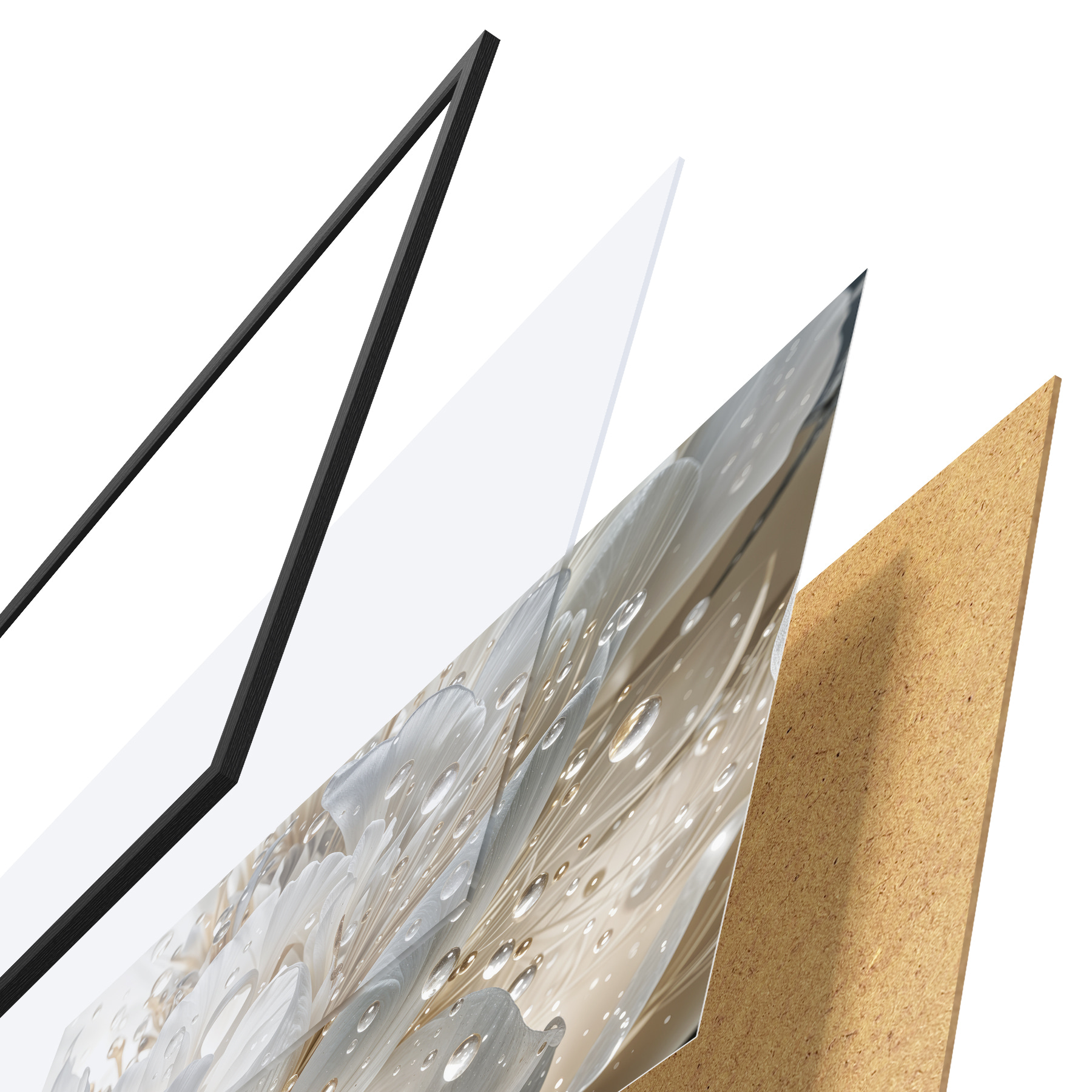 Poster Lähivõte valgest pojengiõiest, mille kroonlehtedel on veepiisad, hägusel taustal Nr f40539