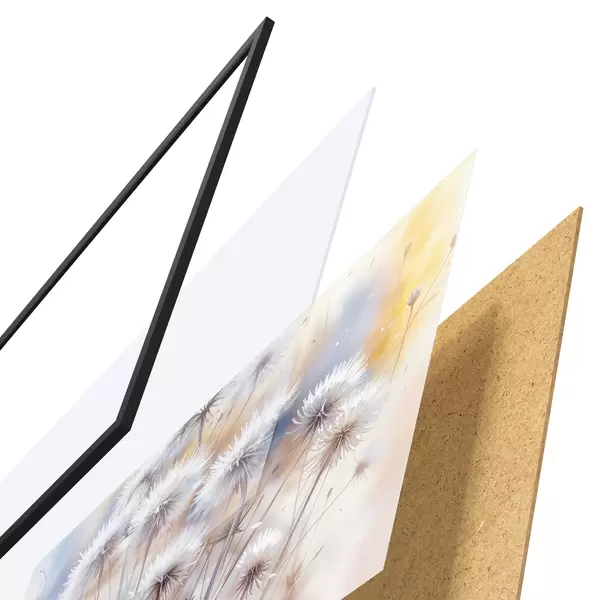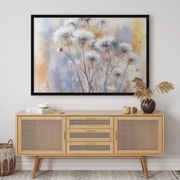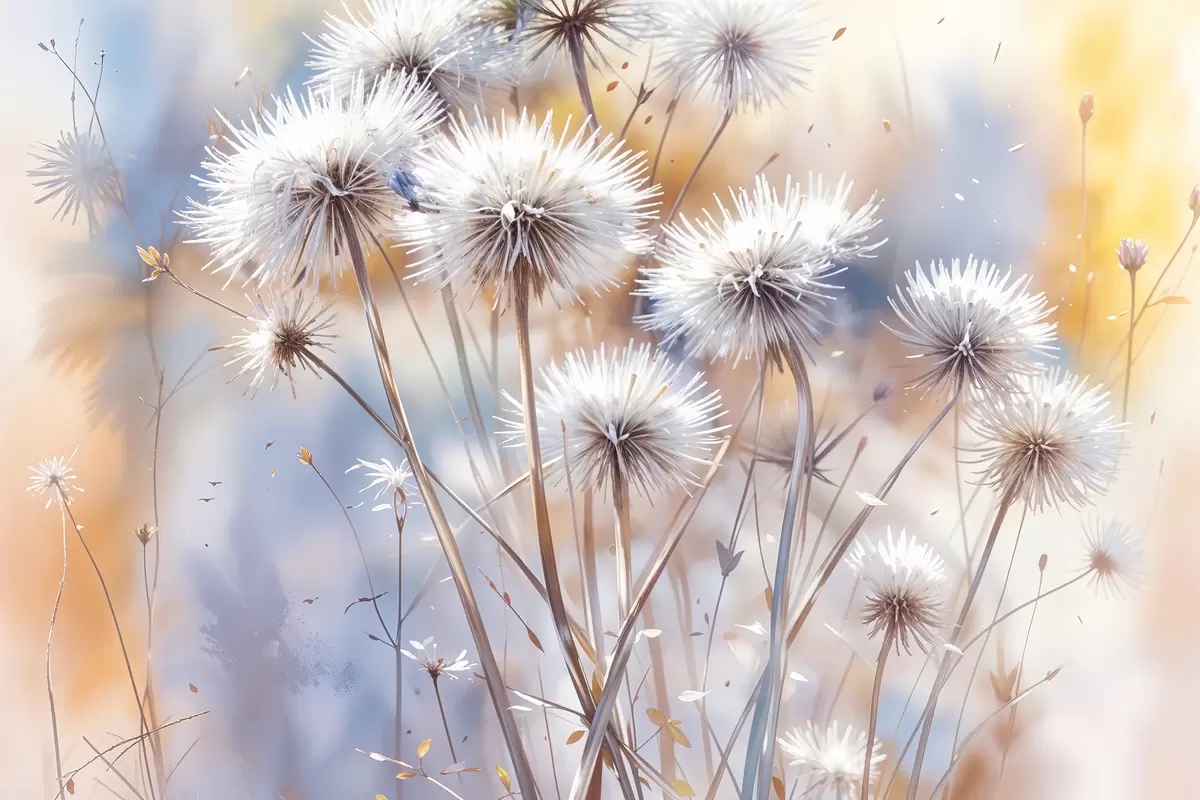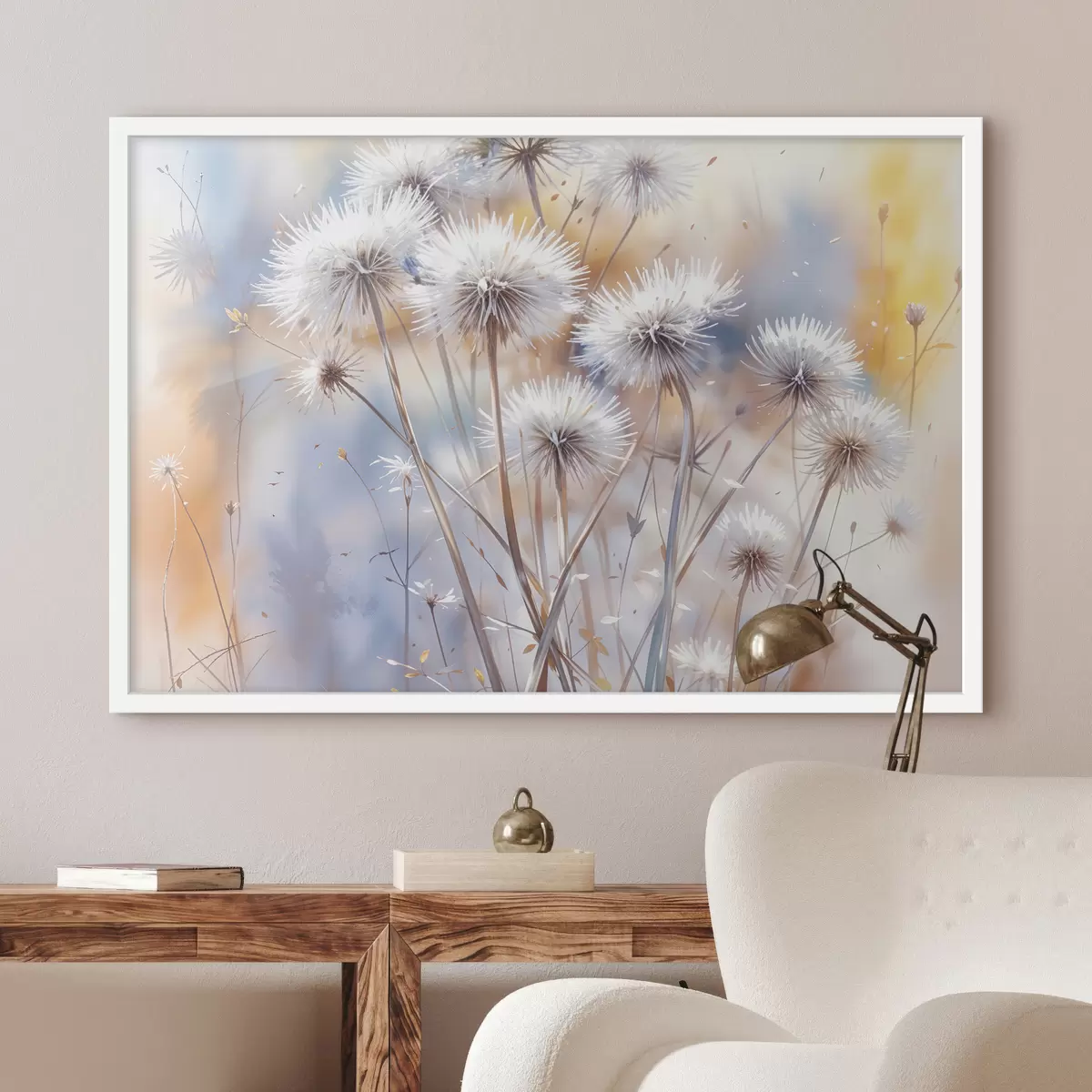 Plakat Kohevad valged võililleõied udusel akvarelltaustal sooja valgustusega f40541