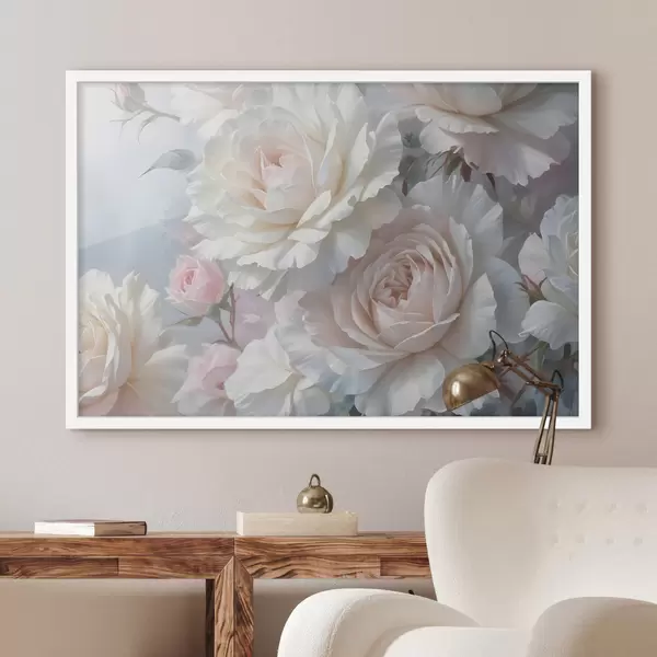 Plakat Pehmed, õrnad valged ja roosad roosid hägusa taustaga f40562