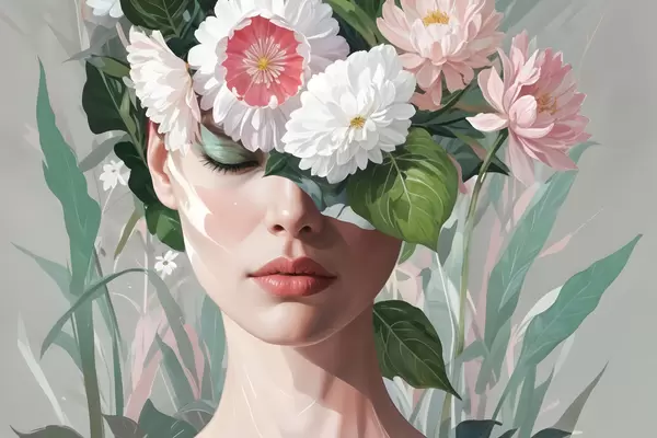 Poster Naine, keda varjab osaliselt suurte roosade ja valgete lillede kimp rohelisel lehtedel taustal Nr f40567