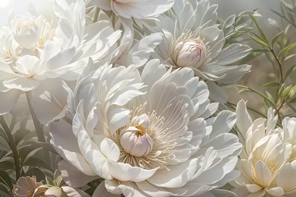 Poster Lähivõte mitmest suurest valgest pojengiõiest, millel on pehmed, õrnad kroonlehed ja kahvatukollased keskused Nr f40575