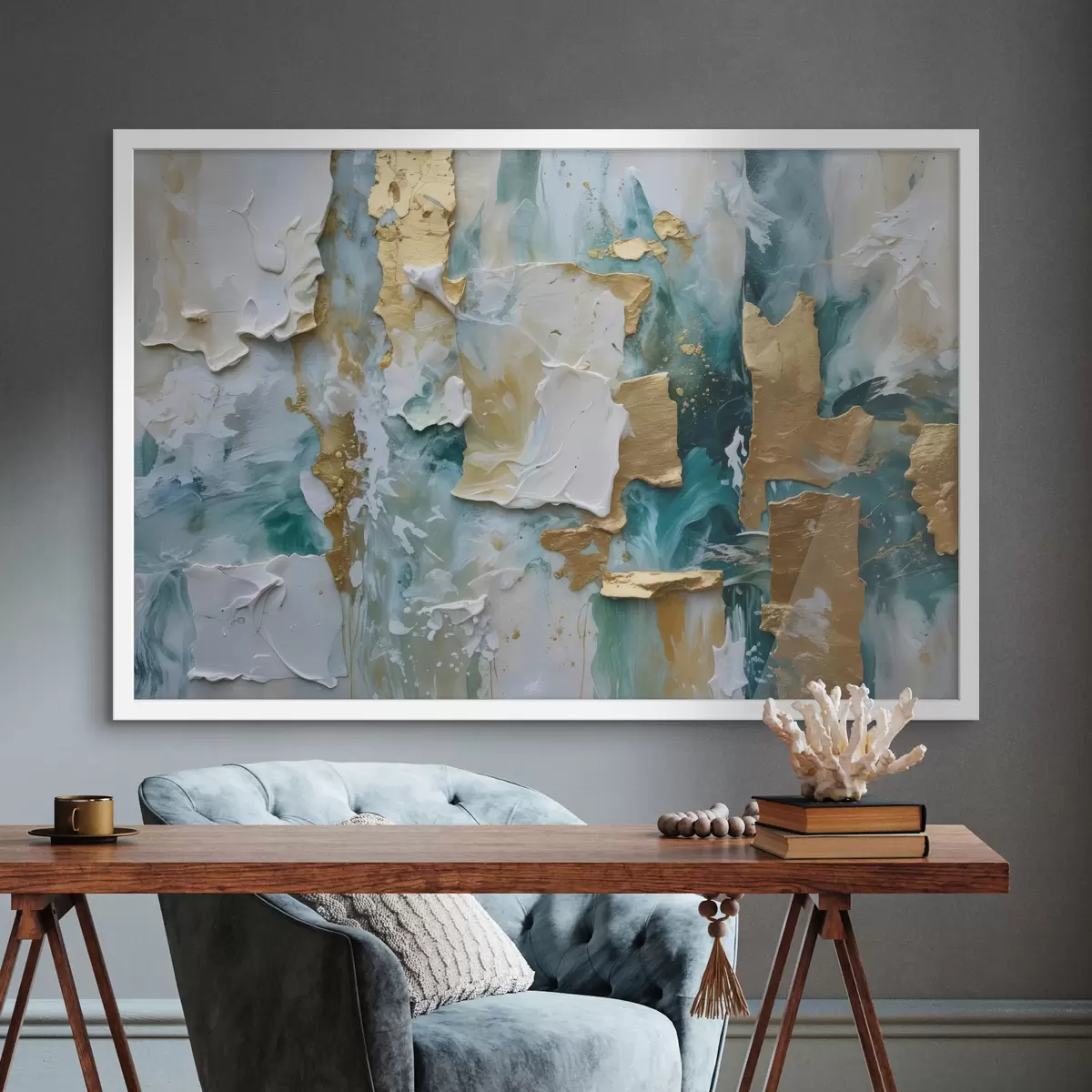 Plakat Valge, sinise ja kollase värvi kihtidega kooriv värv, mis loob abstraktse, tekstureeritud trükise f40577