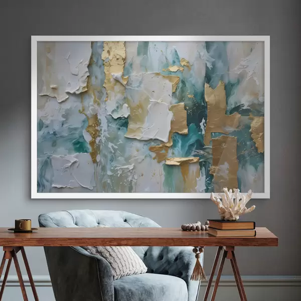 Poster Valge, sinise ja kollase värvi kihtidega kooriv värv, mis loob abstraktse, tekstureeritud trükise Nr f40577