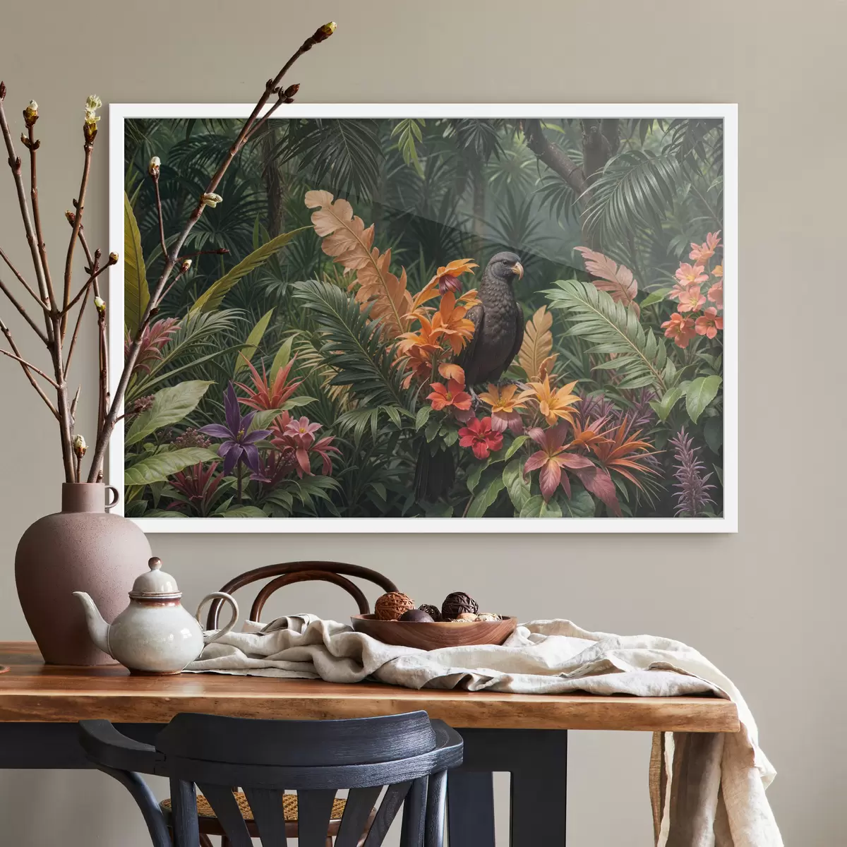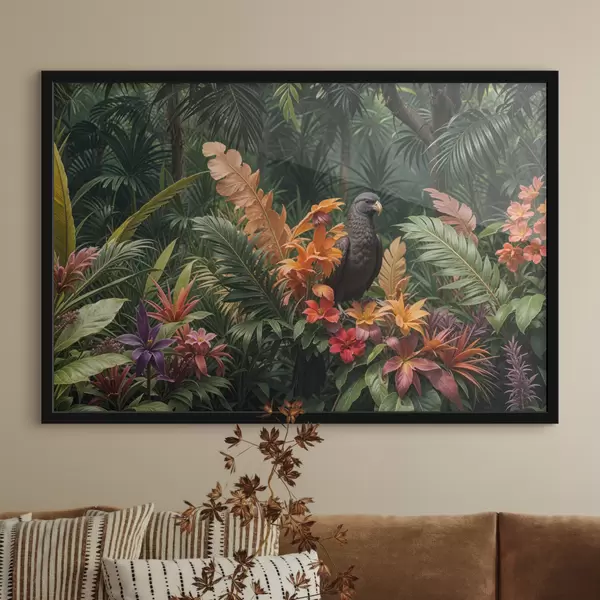 Plakat Troopiline lind istub oksal, mida ümbritseb elav lehestik, palmilehed, lilled ja eksootilised taimed f40578