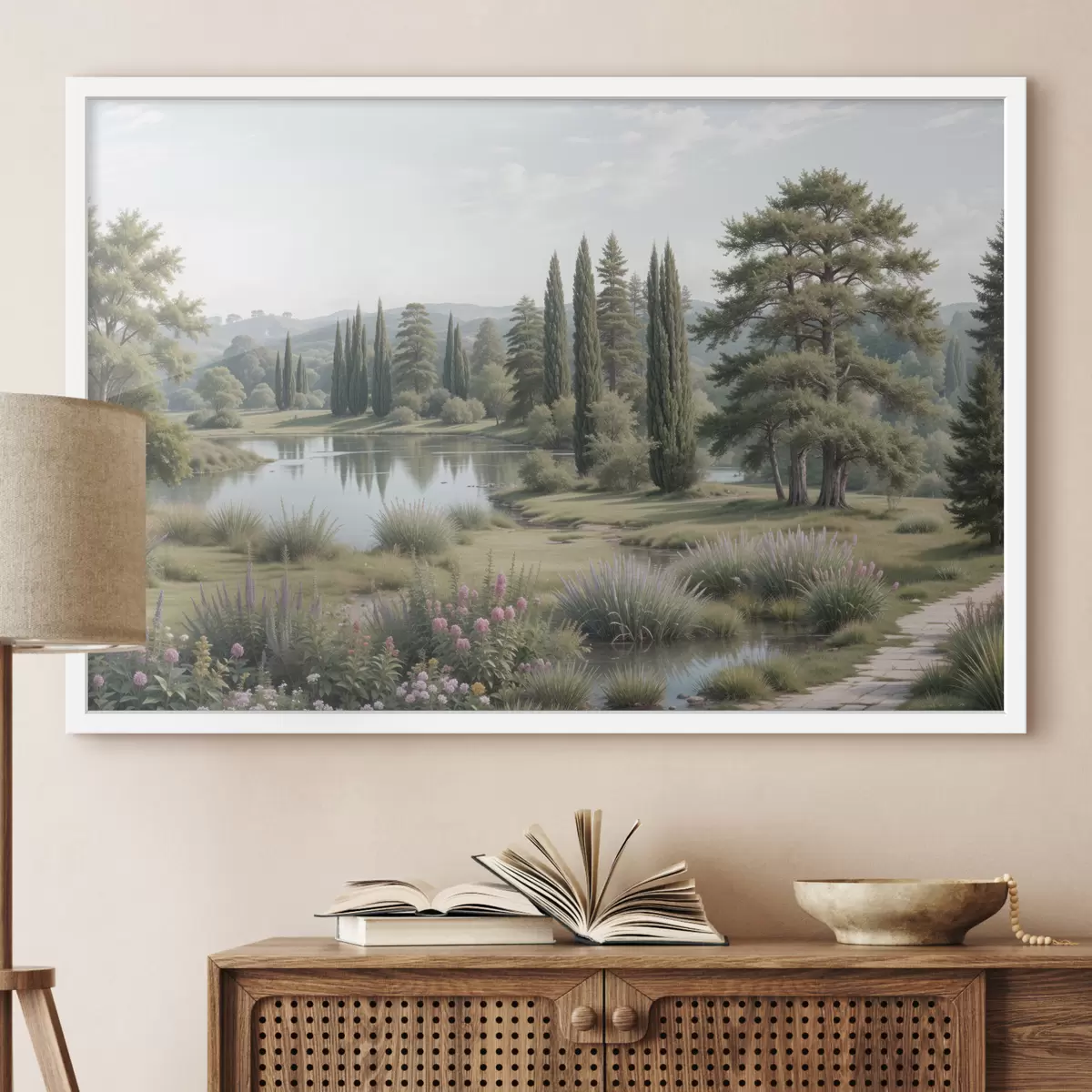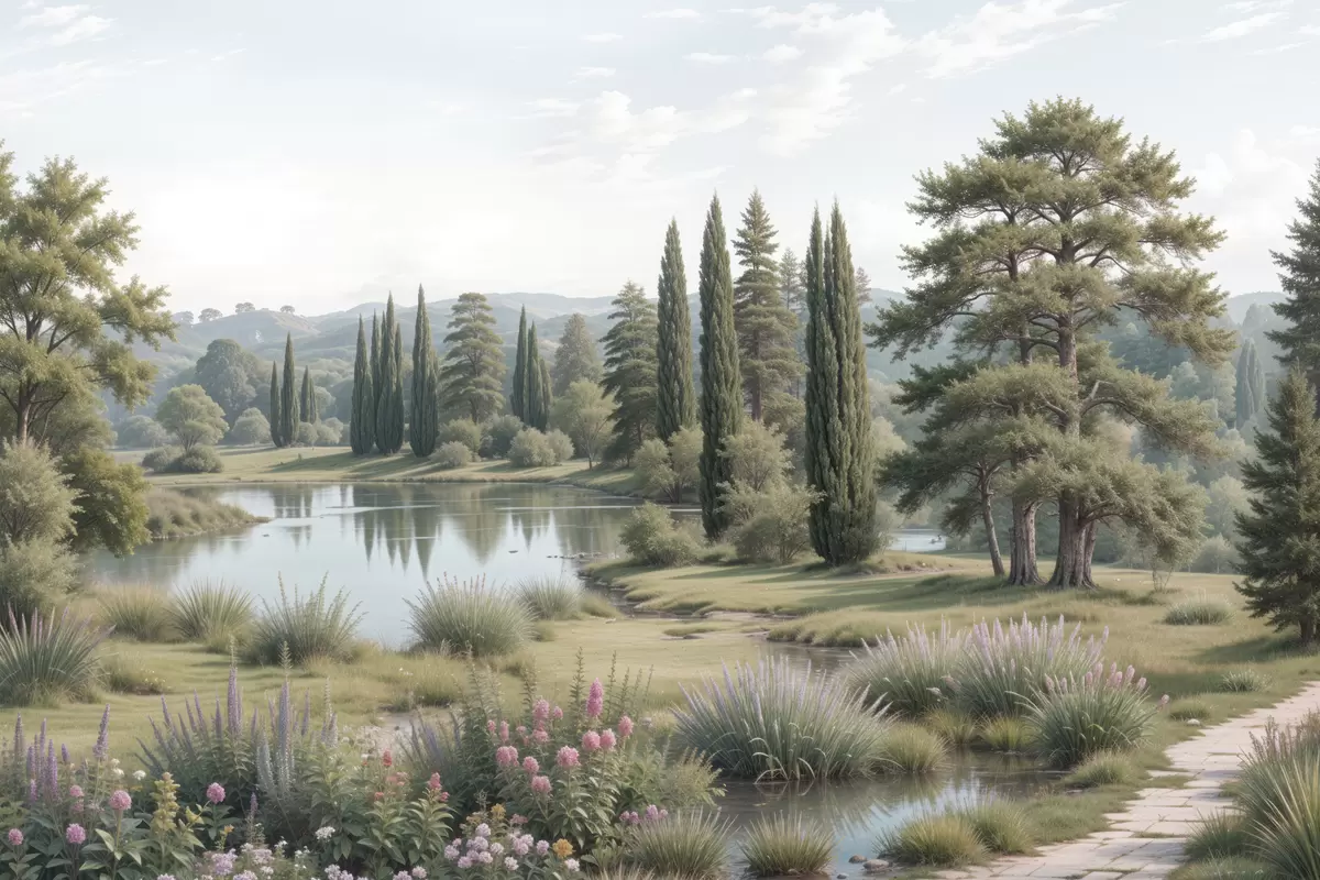Poster Rahulik maastik rahuliku järvega, mida ümbritsevad männipuud, küpressid ja muu lopsakas taimestik Nr f40579