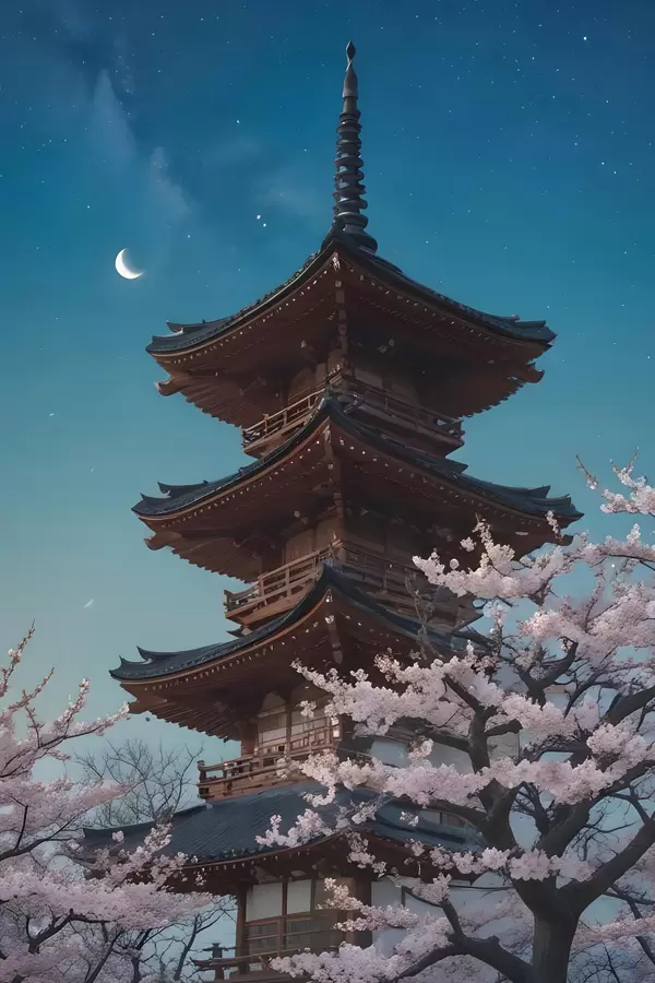 Poster Traditsiooniline Jaapani pagood, mille taevas on poolkuu ja õitsevad kirsiõiepuud Nr f40586